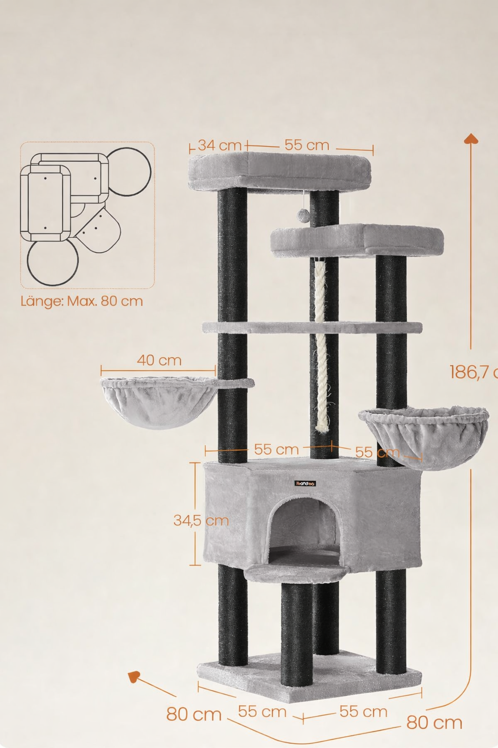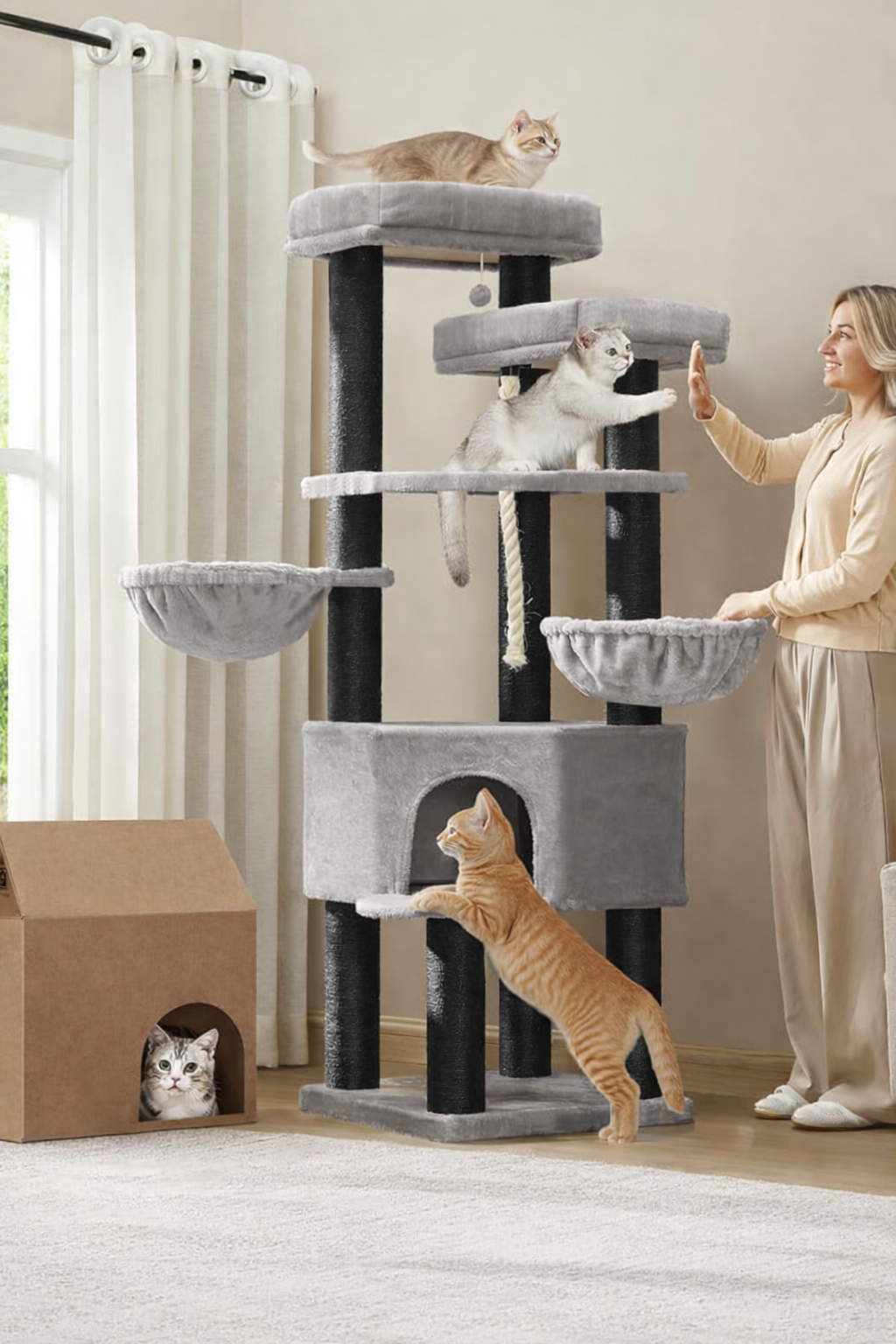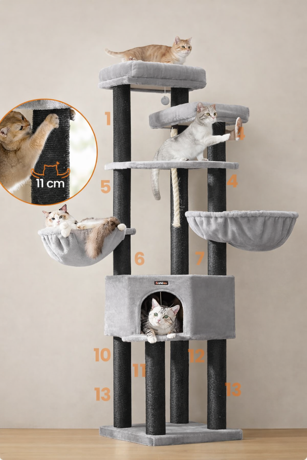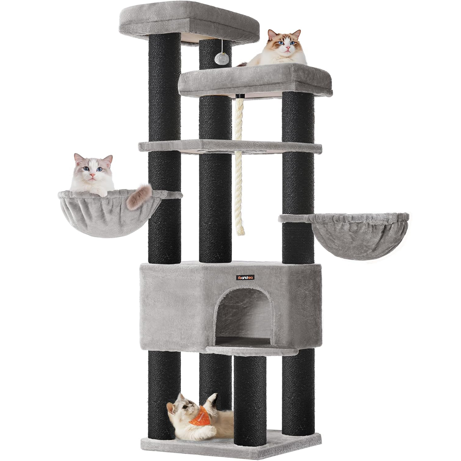 FEANDREA Ansamblu de joaca pentru pisici XXL, 5 niveluri, stalpi sisal, pentru pisici de talie mare, 55x55x187 cm, gri