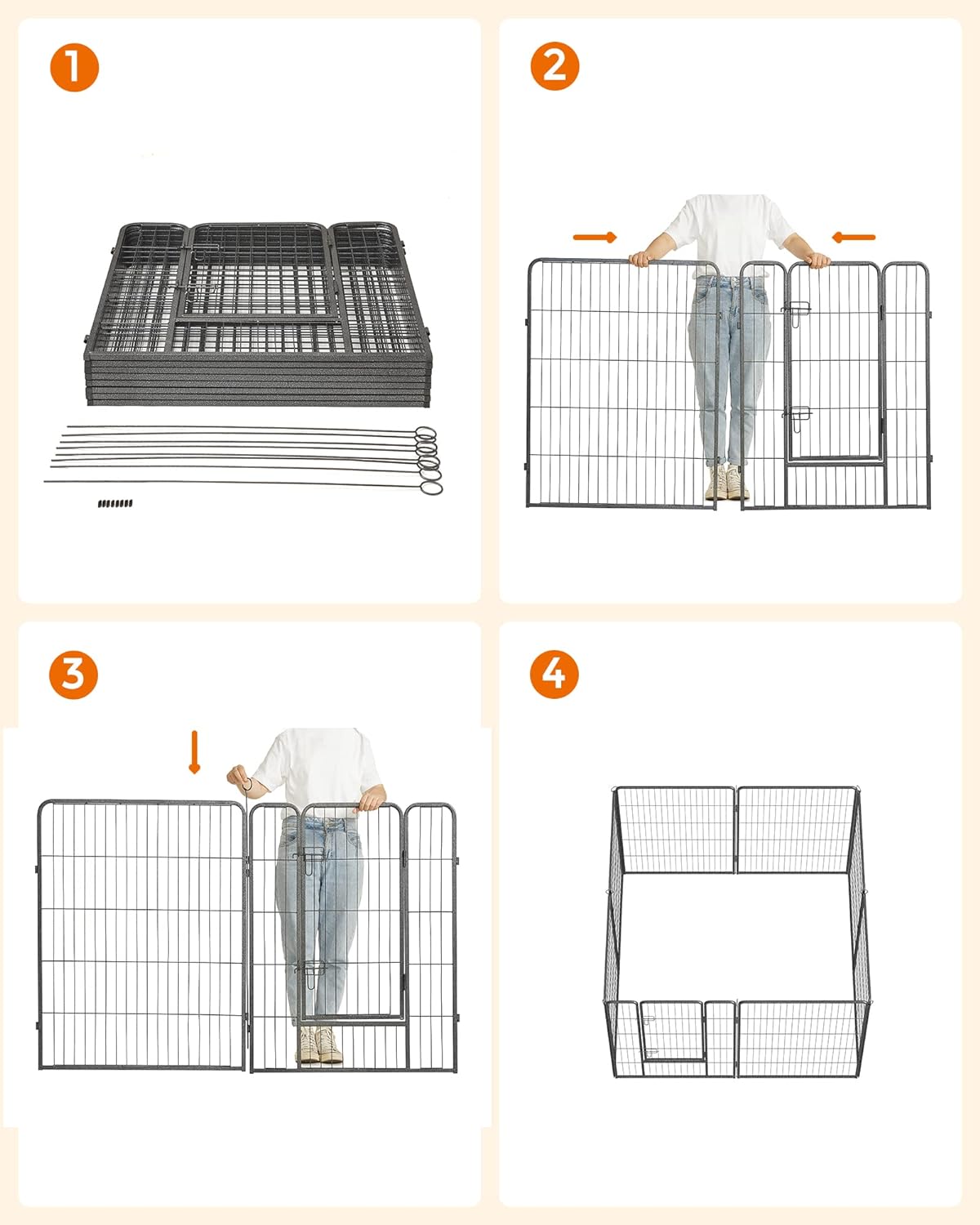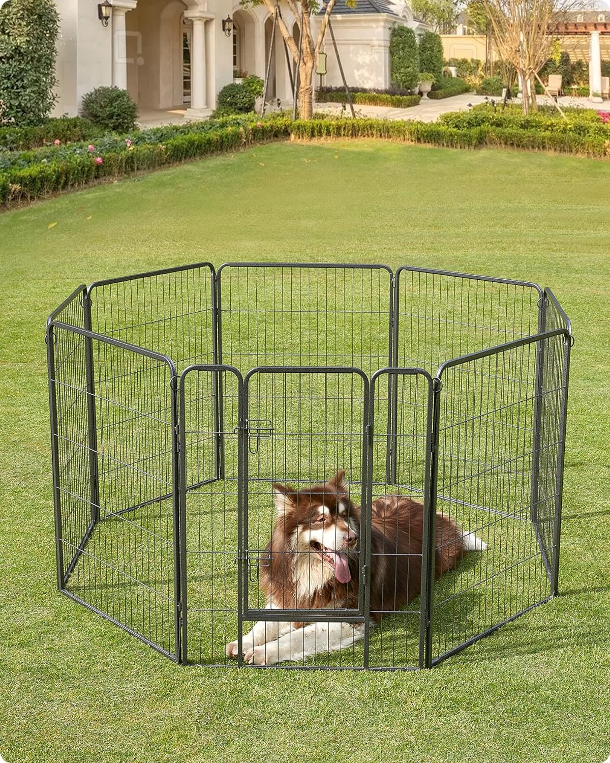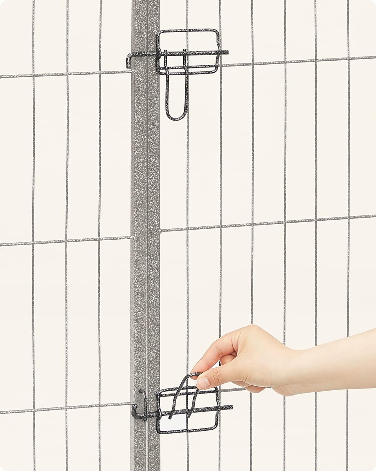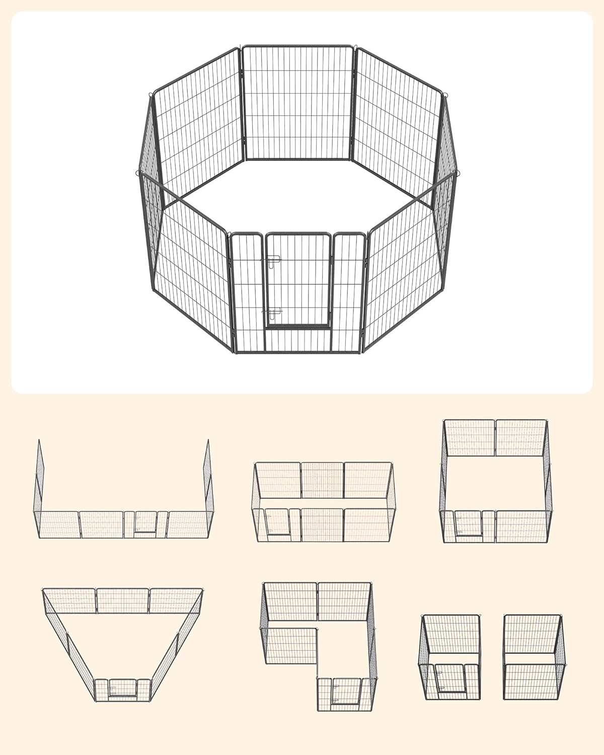 Acest tarc pentru caini mari este o alegere practica atat pentru interior, cat si pentru exterior. Se monteaza rapid, se demonteaza usor si se pliaza compact atunci cand nu este folosit. Glisoarele pentru podea ajuta la protejarea suprafetelor, iar tijele de legatura pot fi utilizate pentru fixare suplimentara in sol, daca folosesti tarcul in curte sau gradina.
