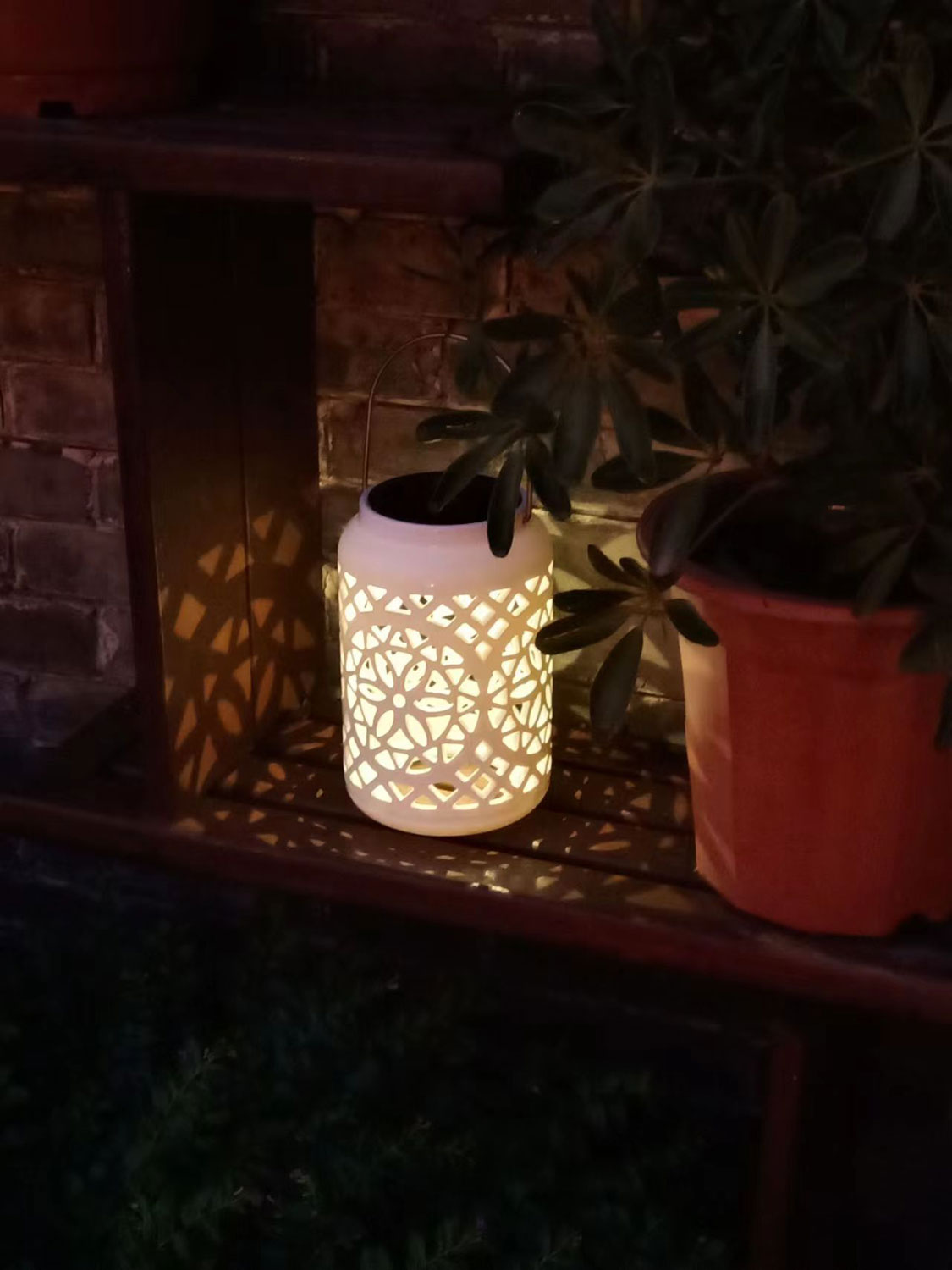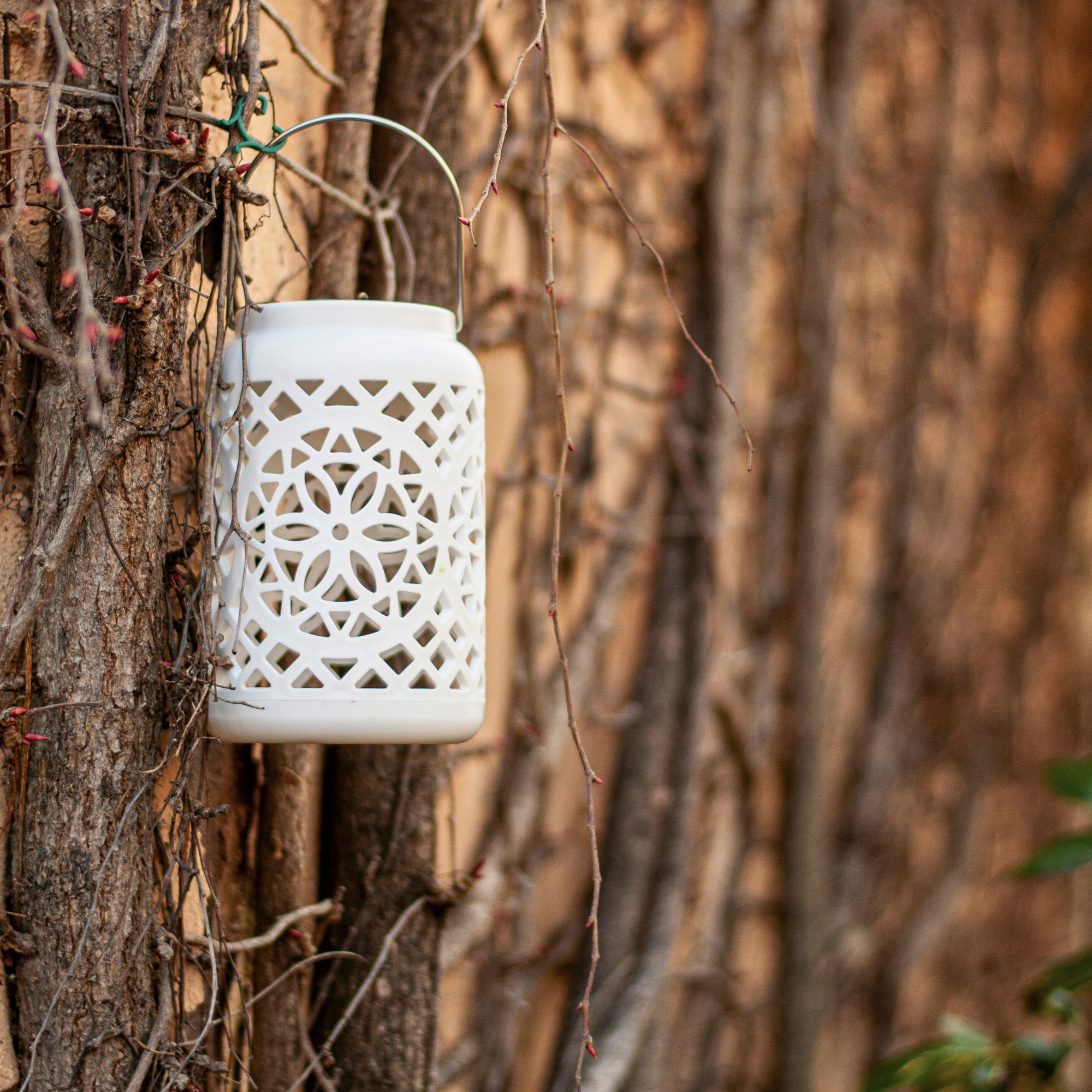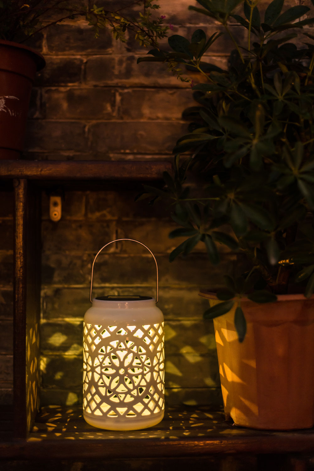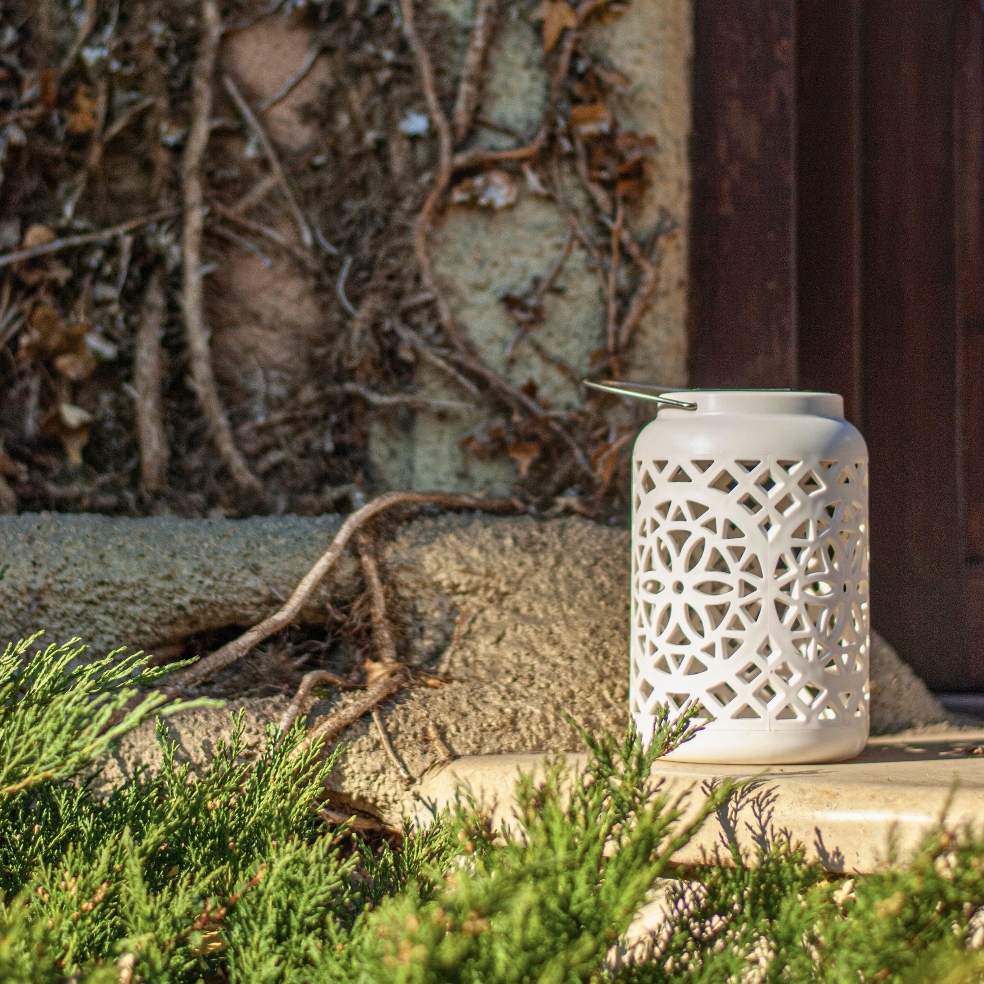 Adauga un plus de farmec spatiului tau exterior cu acest felinar decorativ solar cu LED pentru exterior, realizat intr-o nuanta eleganta de alb. Modelul perforat cu aspect floral creeaza jocuri placute de lumina si umbre, oferind o atmosfera relaxanta si primitoare pe terasa, balcon, in gradina sau la intrarea in casa.