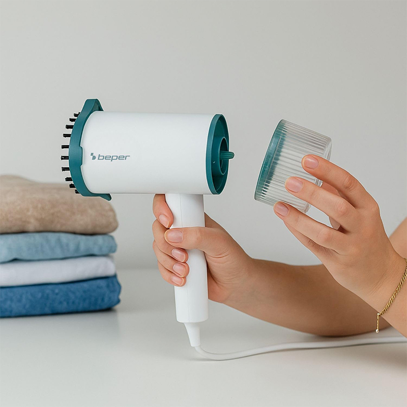 CĂLCĂ, REÎMPROSPĂTEAZĂ ȘI DEZINFECTEAZĂ: Aparatul de călcat cu abur vertical Beper îndepărtează rapid cutele, mirosurile și bacteriile de pe haine direct pe umeraș, fără a fi nevoie de fier clasic de călcat