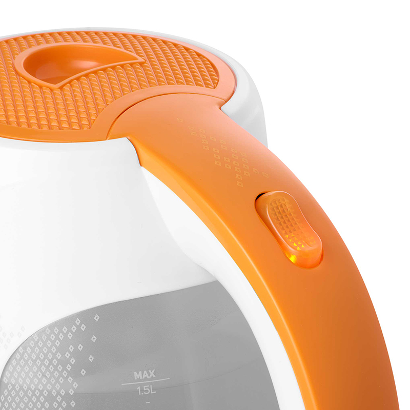 Fierbător electric, capacitate 1,5 l 2 Element de încălzire ascuns de 200 W Torcare fără picurare Buton pentru deschiderea capacului Fereastră mare pentru apă Filtru anticalcifiere detașabil și lavabil Întrerupător pornit/oprit cu iluminare de fundal Protecție de siguranță la fierbere uscată și supraîncălzire Oprire automată Bază fără fir cu spațiu de depozitare a cablului Bază pivotantă la 360°