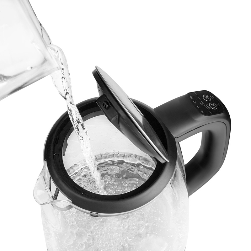 Fierbător electric cu temperatură variabilă Volum: 2 l Menține temperatura setată timp de 30 de minute Putere: 2 200 W Setări de temperatură a apei: 50-70-80-90-100 °C Trei moduri de operare: - încălzește apa la 100 °C - încălzețte apa la o temperatură selectată (50-70-80-90-100 °C) - menține apa la o temperatură selectată (50-70-80-90 °C) timp de 30 de minute Când s-a atins temperatura setată, se emite un sunet Lumină LED internă cu o culoare variabilă, funcție de temperatura setată: - Verde când temperatura este setată la 50°C - Albastru când temperatura este setată la 70°C - Violet când temperatura este setată la 80°C - Portocaliu când temperatura este setată la 90°C Inaltime: 24,5 cm Latime: 22 cm Adancime: 18,7 cm Culoare: Negru Greutate: 1 kg