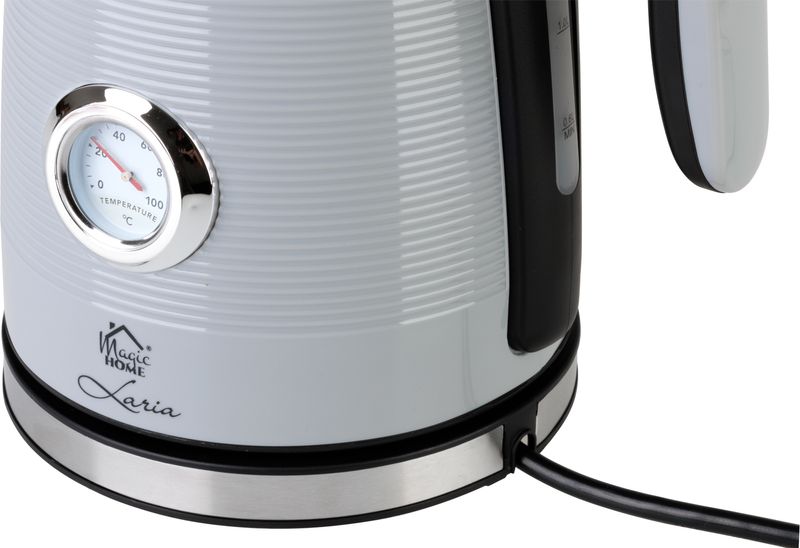 Fierbatorul electric MagicHome Laria este alegerea potrivita pentru cei care isi doresc un aparat practic, elegant si usor de folosit zi de zi. Cu un design modern in nuante de gri/alb si detalii inox, acest fierbator electric cu termometru aduce un plus de stil in orice bucatarie, fiind ideal pentru prepararea rapida a ceaiului, cafelei sau a altor bauturi calde.