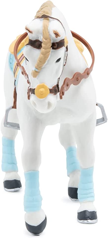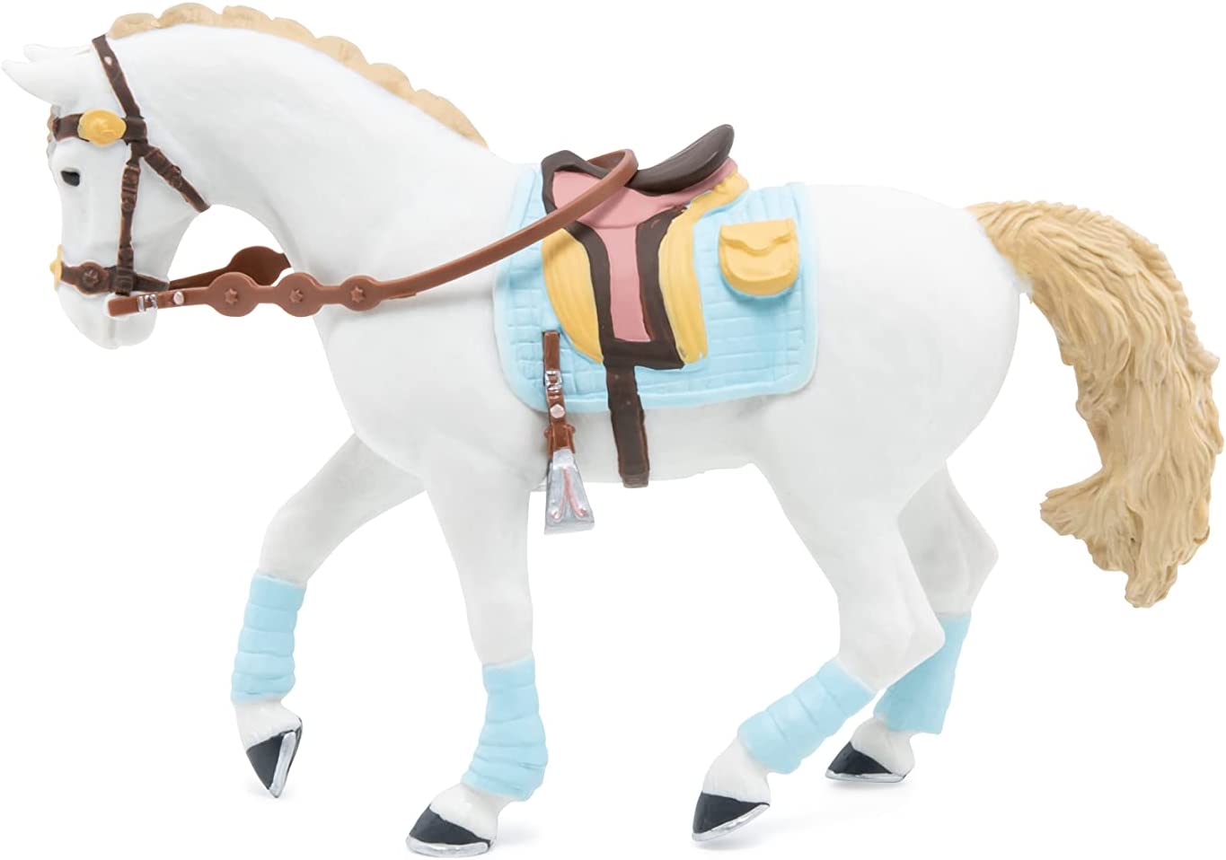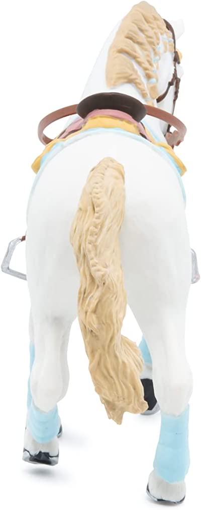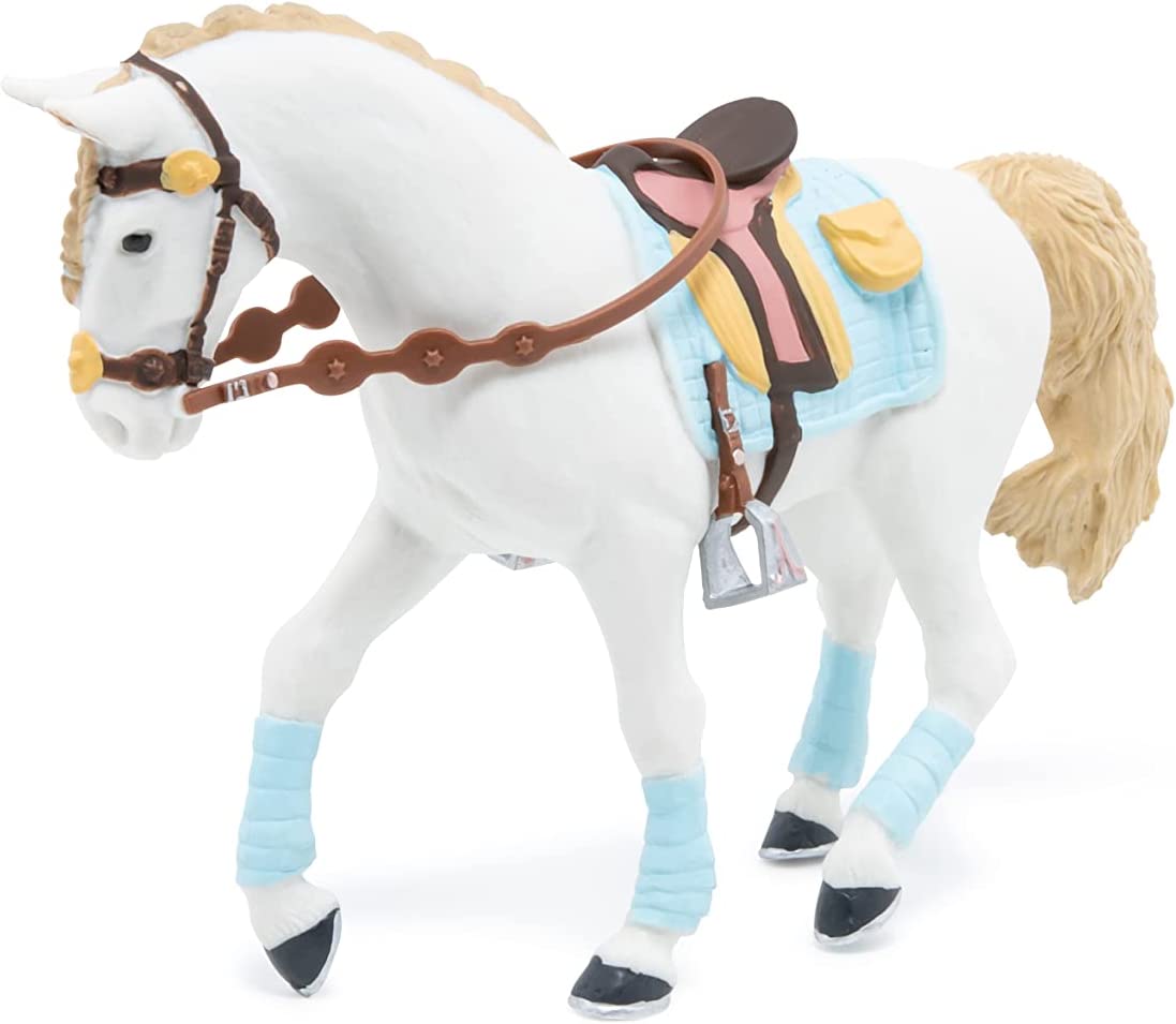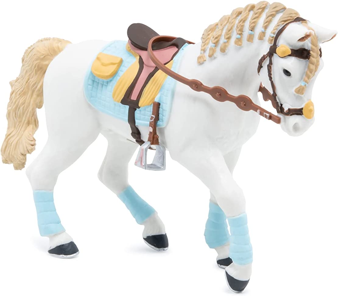 Figurina este potrivită atât pentru joacă de zi cu zi, cât și pentru colecționari, fiind creată de brandul francez Papo, recunoscut pentru modelele sale expresive și pentru calitatea execuției. Coama împletită, șaua detaliată și benzile albastre completează aspectul unui cal de echitație pentru copii gata de concurs.
