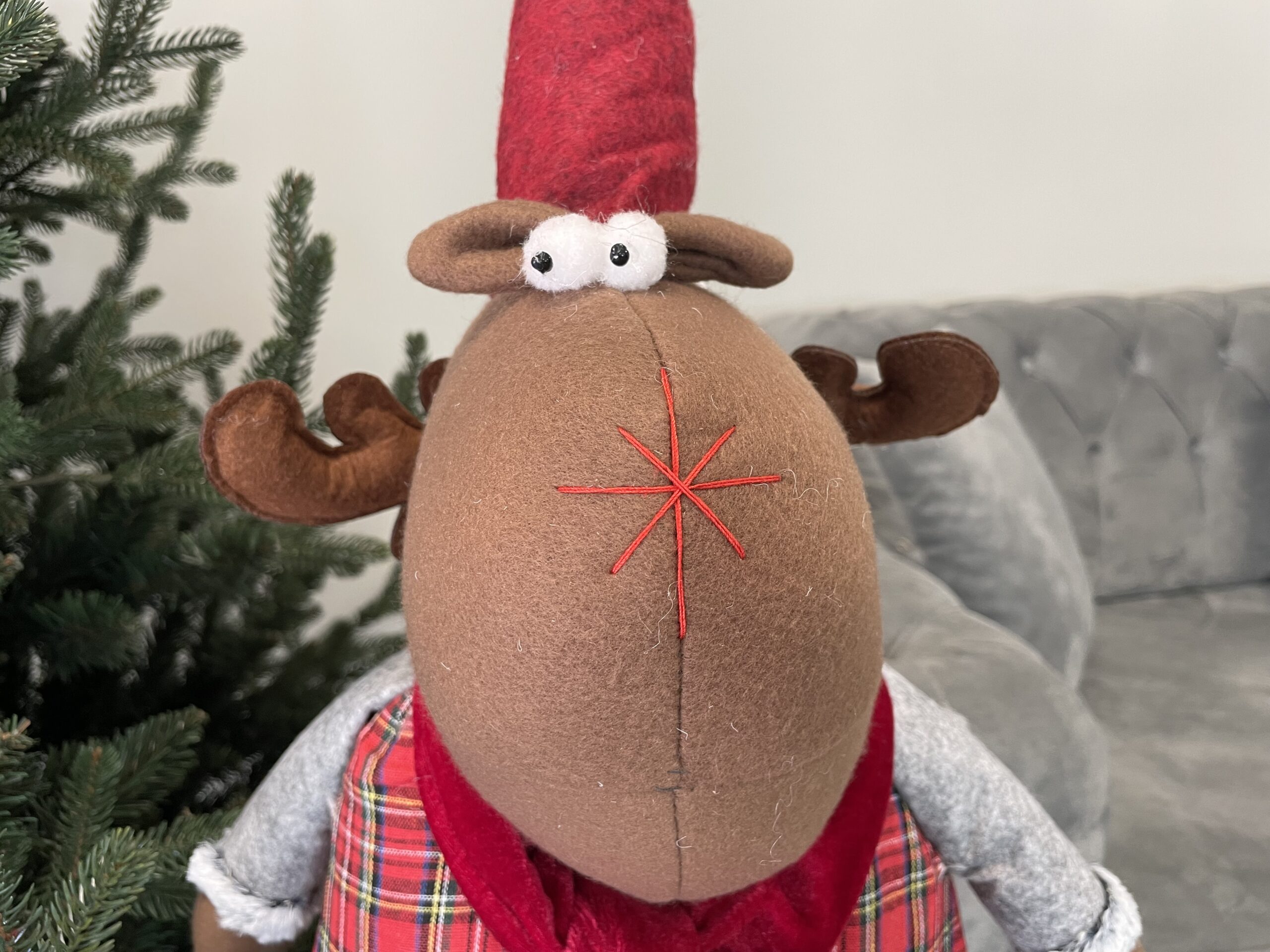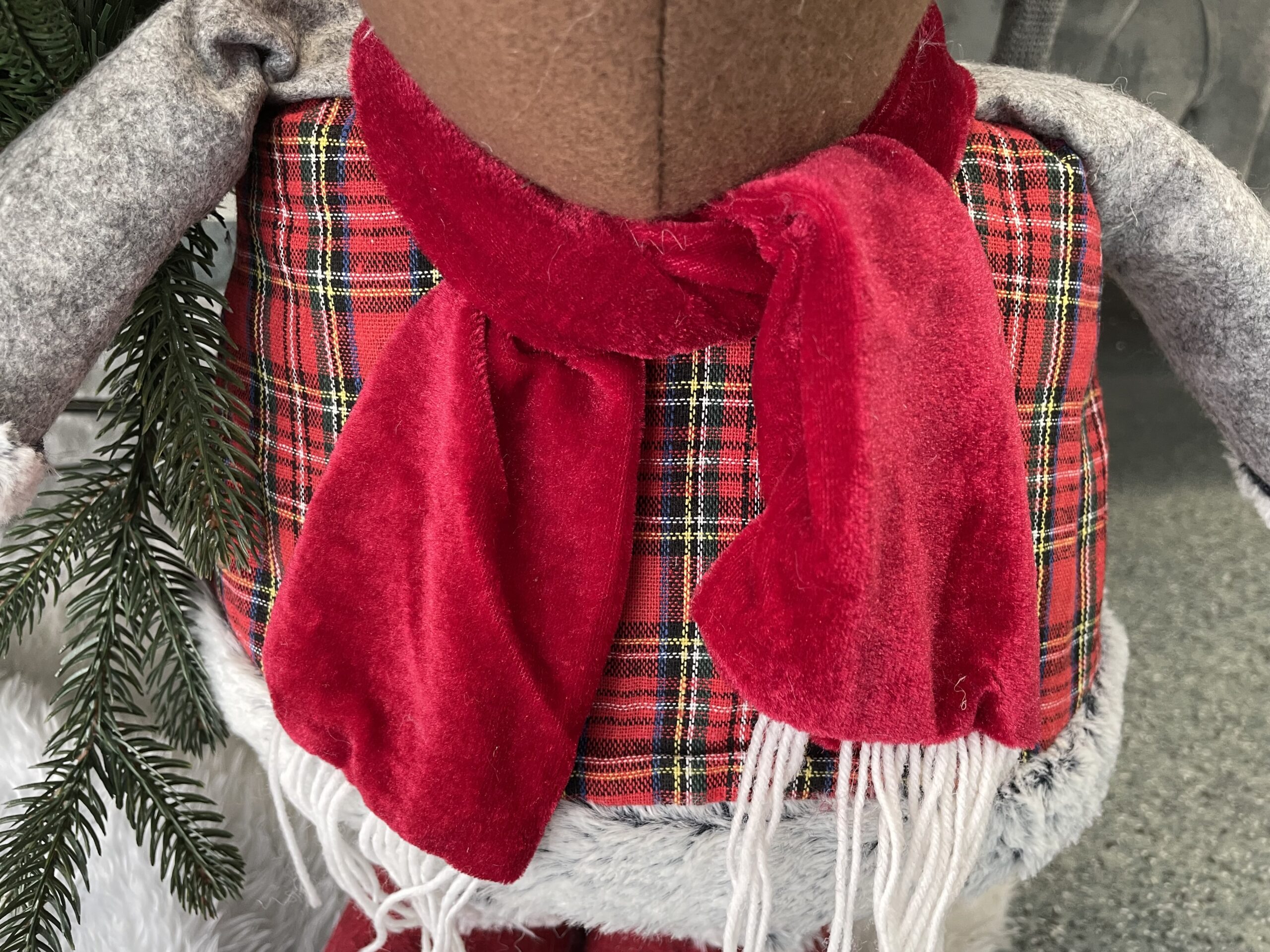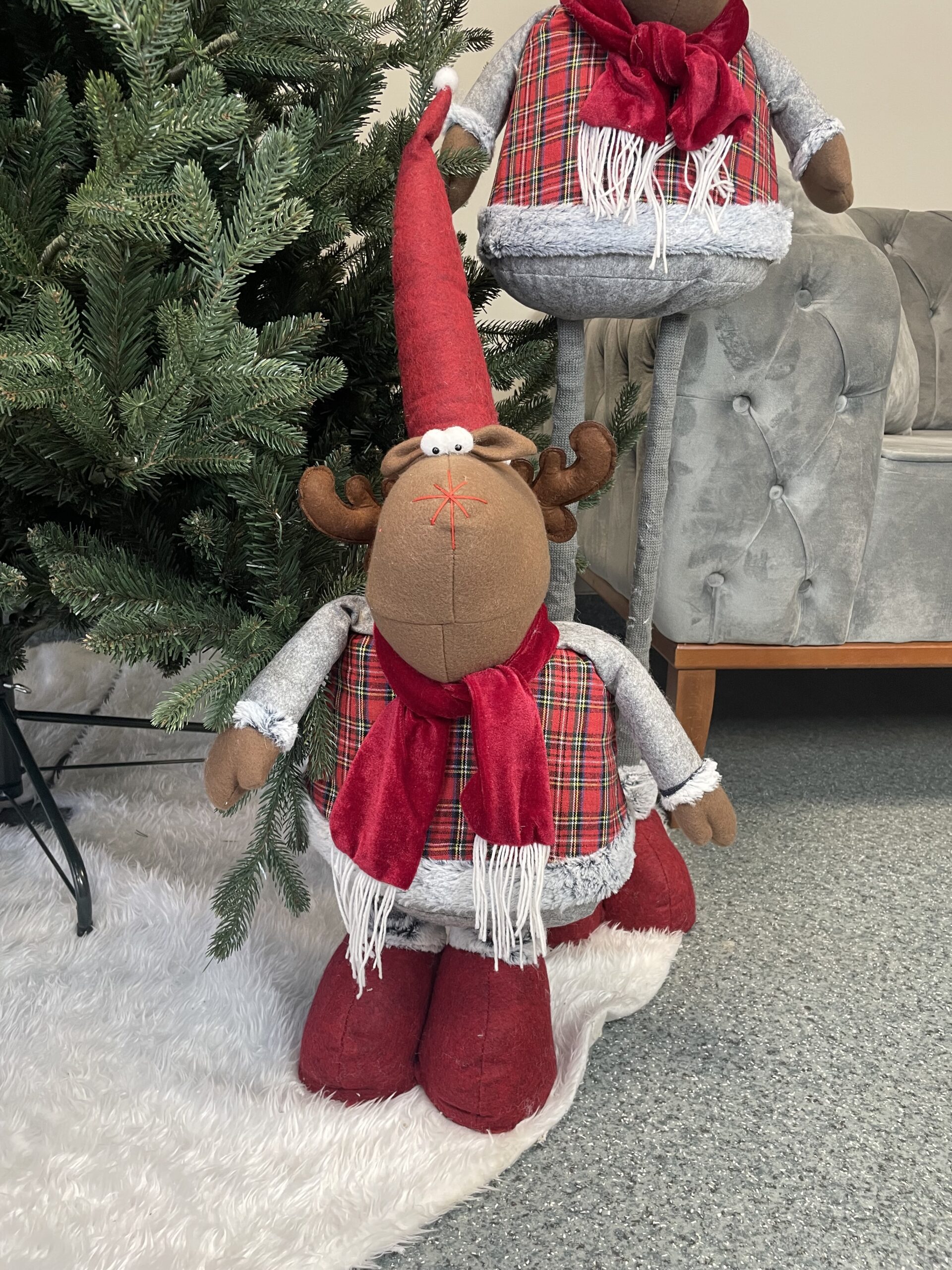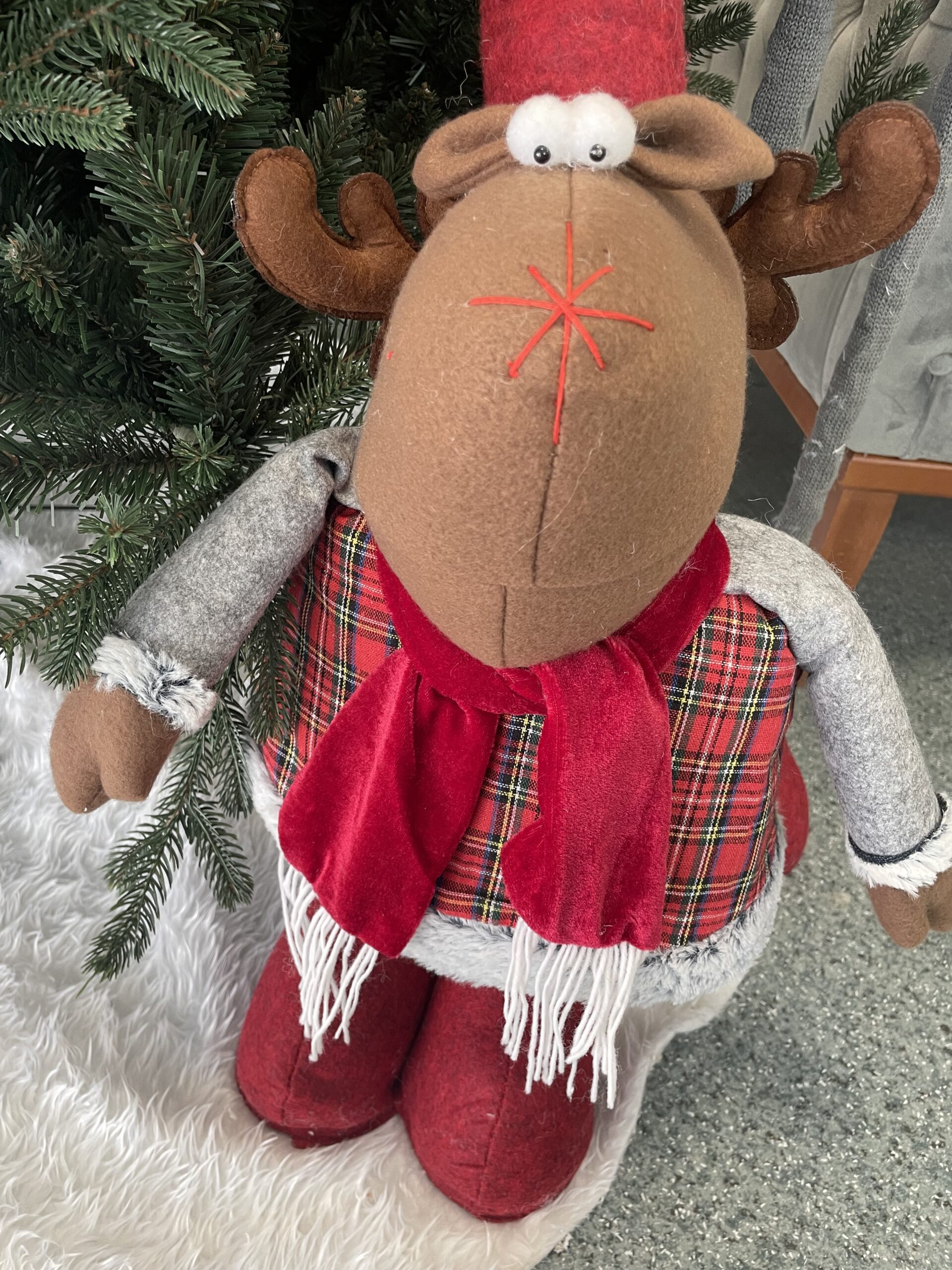 Adaugă un plus de farmec sărbătorilor cu această figurină de Crăciun în formă de ren decorativ, realizată din stofă și prevăzută cu picioare telescopice. Înălțimea reglabilă între 55 și 95 cm îți permite să o integrezi ușor lângă brad, în hol, living, birou sau vitrină, pentru o atmosferă festivă caldă și primitoare.