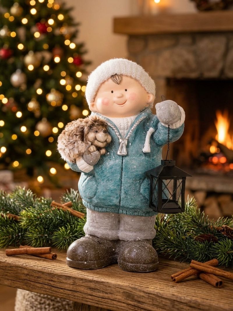 Figurină decorativă de Crăciun băiețel cu lampă și arici, ceramică