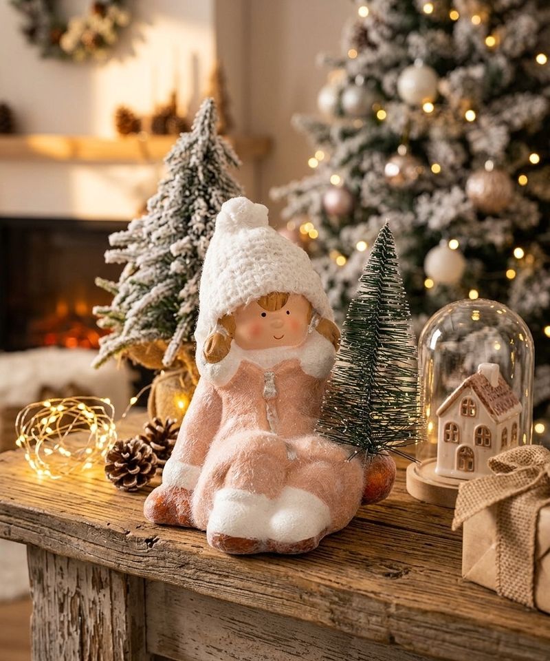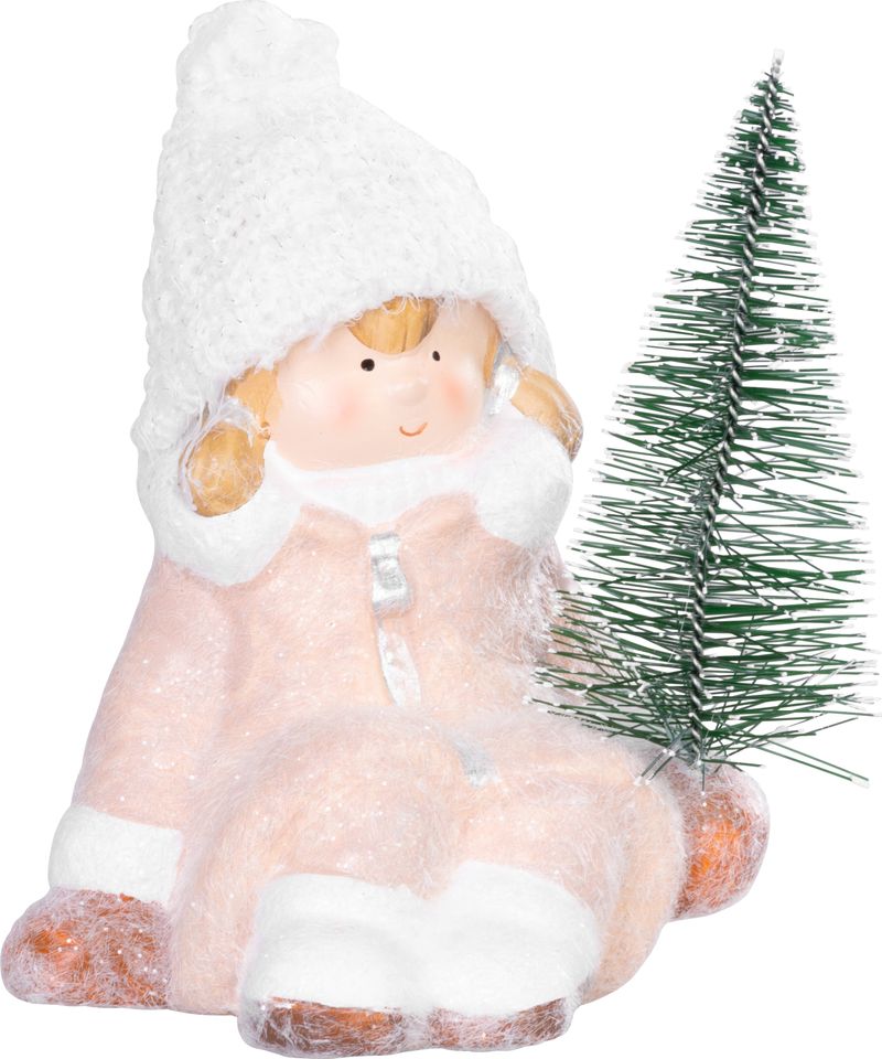 Figurină decorativă de Crăciun cu fetiță și brăduț, teracotă, 17 cm