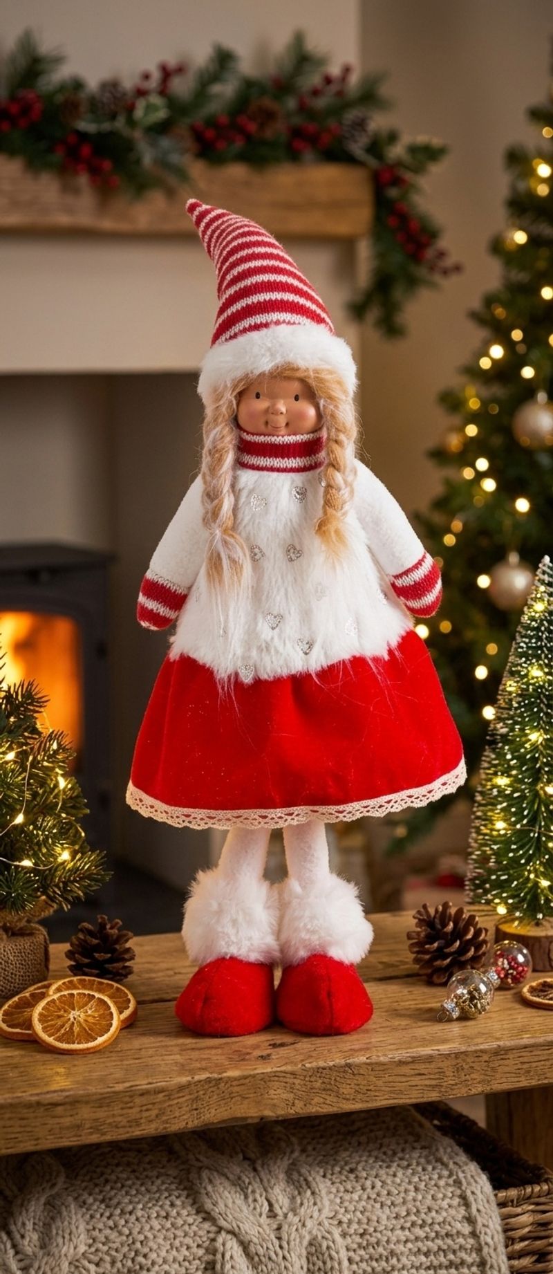 Figurină decorativă de Crăciun MagicHome, fetiță textilă roșu-alb, 48 cm