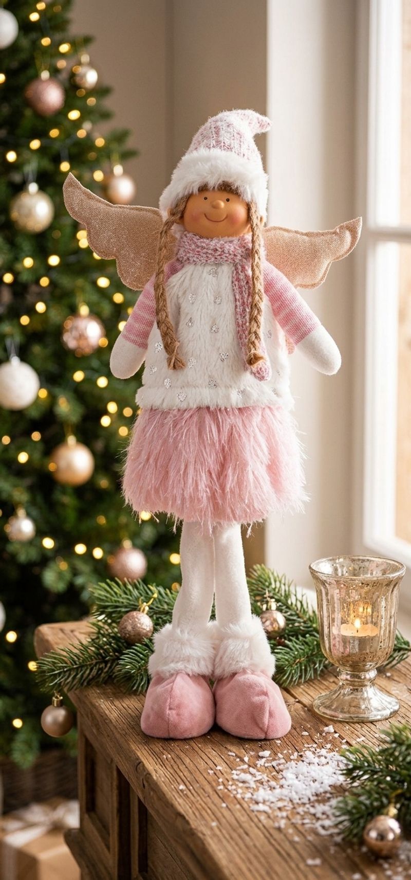 Poate fi așezată pe podea, lângă brad, în zona de intrare, lângă șemineu sau în spațiile comerciale decorate de sărbătoare. Este o alegere inspirată pentru cei care caută un înger de Crăciun decorativ cu aspect cald și expresiv.