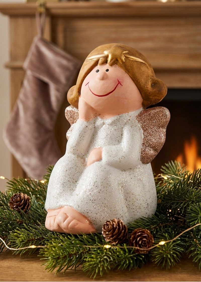 Descriere Figurina decorativa inger sezand Craciun, alb-auriu,