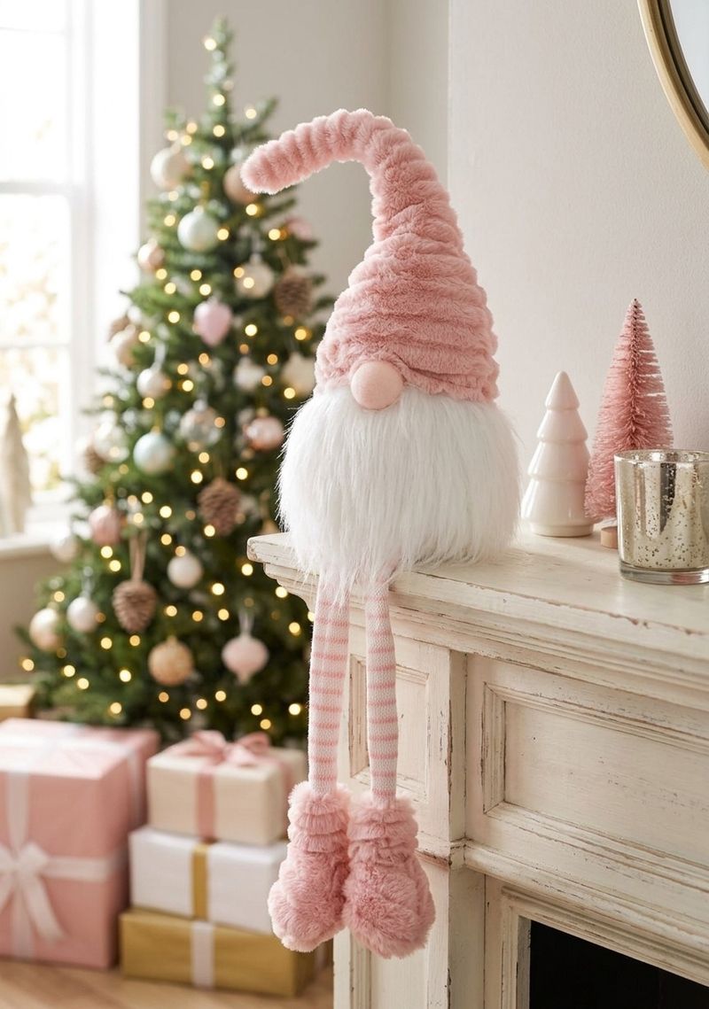 Figurina spiridus de Craciun cu picioare lungi, roz-alb, 42 cm