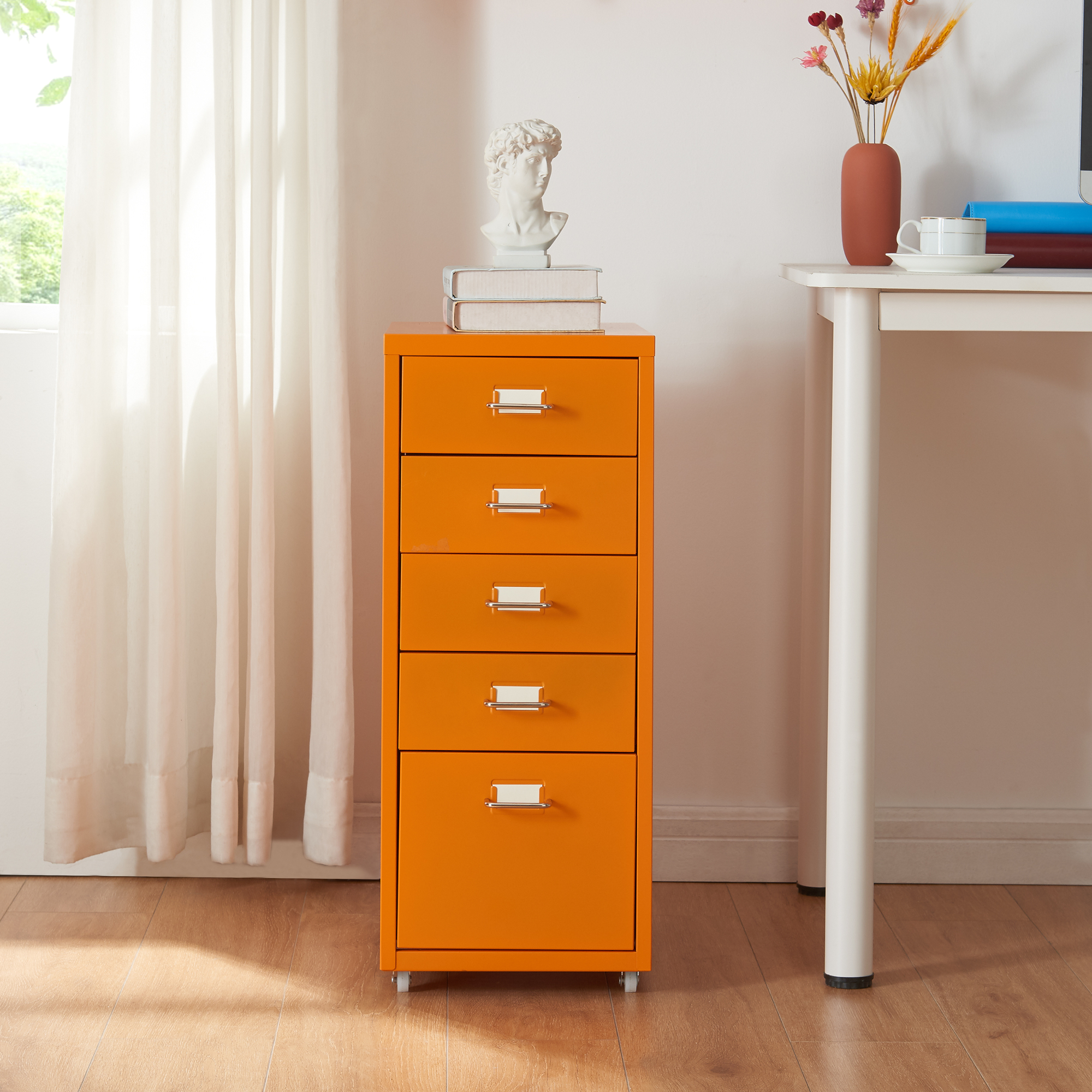 Fișetul mobil cu 5 sertare este soluția practică și modernă pentru organizarea documentelor, accesoriilor de birou și obiectelor utile din spațiul de lucru. Cu un design compact și o nuanță portocalie energică, acest corp cu sertare pe roți se integrează ușor în birou, home office sau camera de studiu.