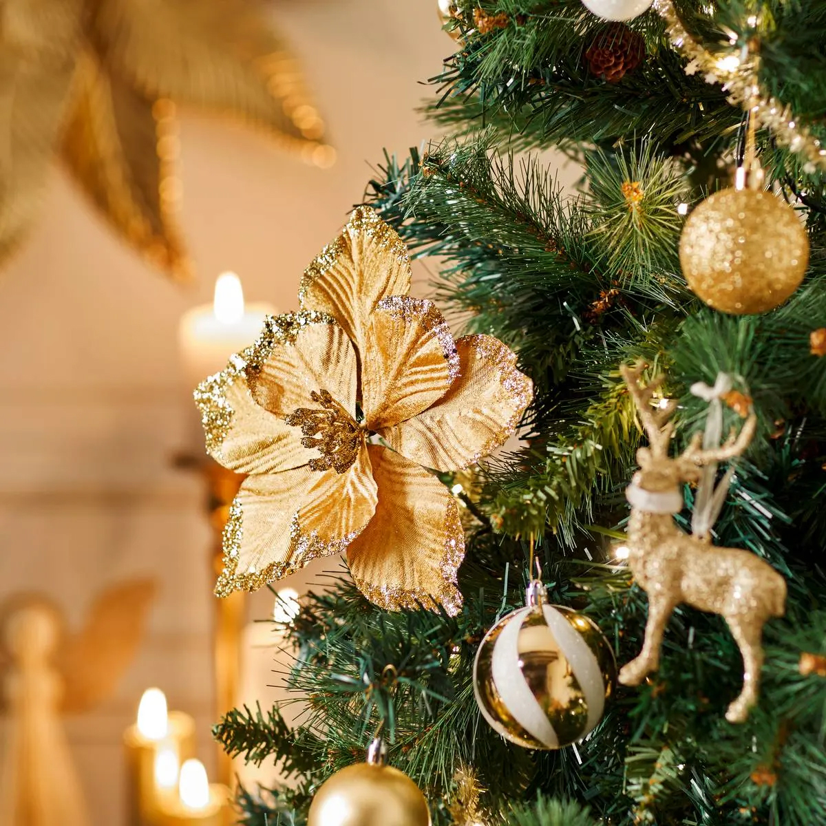 Adauga un plus de eleganta decorului festiv cu aceasta floare decorativa de Craciun tip poinsettia aurie, realizata din poliester si otel. Designul rafinat, cu finisaj stralucitor si margini sclipitoare, o face ideala pentru brad, coronite, ghirlande sau aranjamente de masa. Sistemul cu clip de fixare permite prinderea rapida si usoara in decorurile tale preferate.