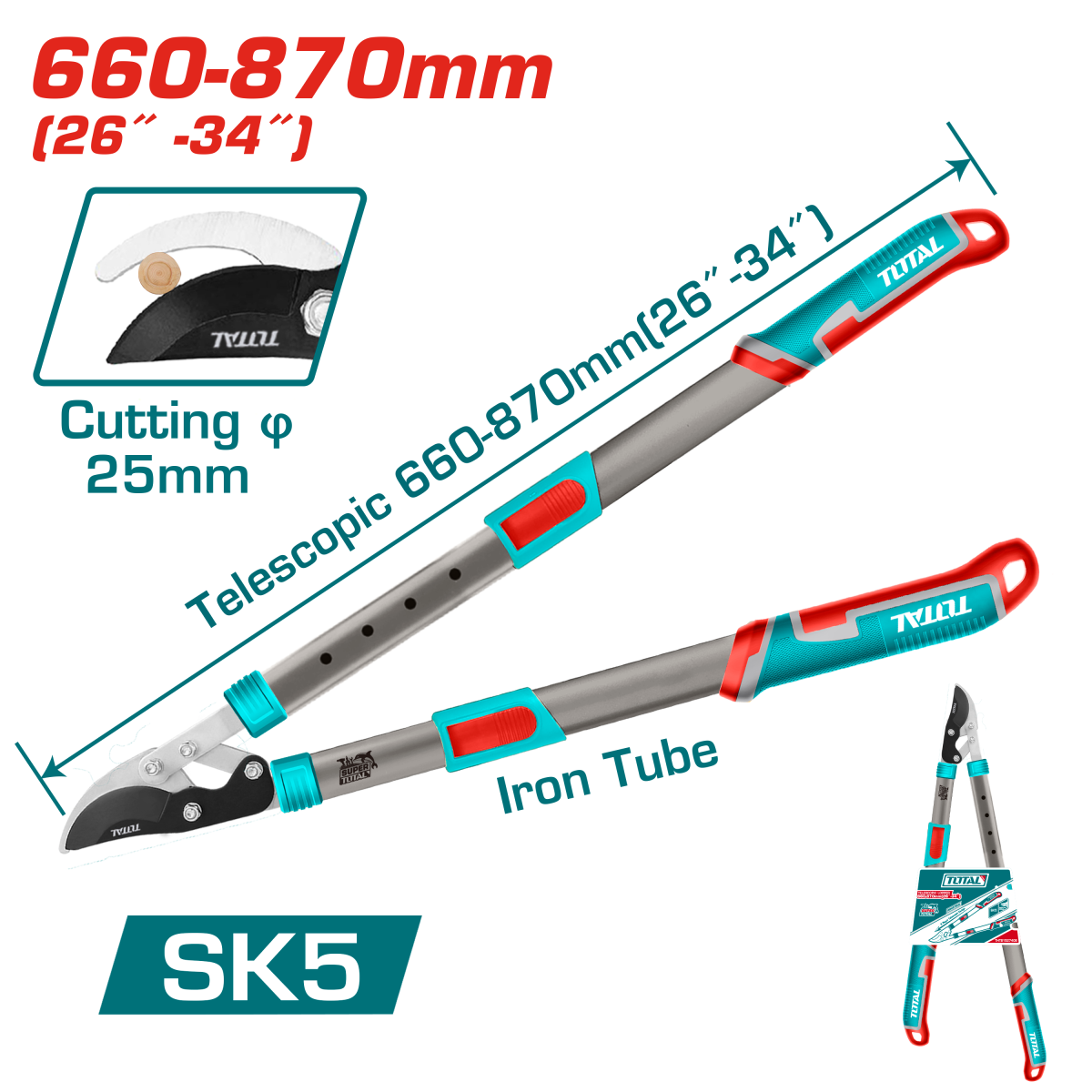 Foarfecă telescopică pentru crengi TOTAL, 660-870 mm, lamă SK5