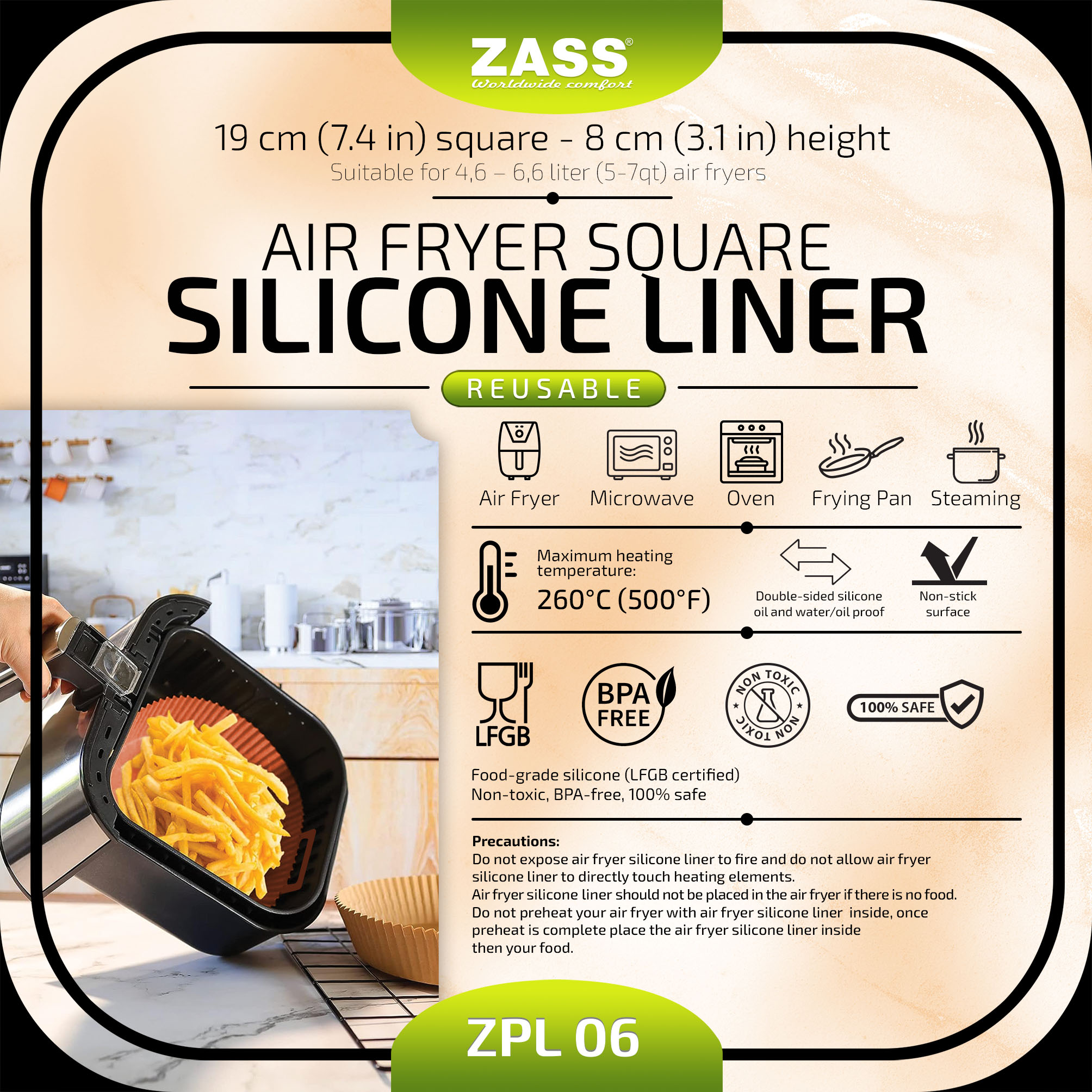 Alege o forma din silicon pentru friteuza cu aer practica si durabila, ideala pentru gatit mai curat si mai simplu. Modelul Zass ZPL 06 are format patrat de 19 cm, este realizat din silicon alimentar certificat LFGB si te ajuta sa protejezi cosul friteuzei, reducand depunerile si timpul de curatare.