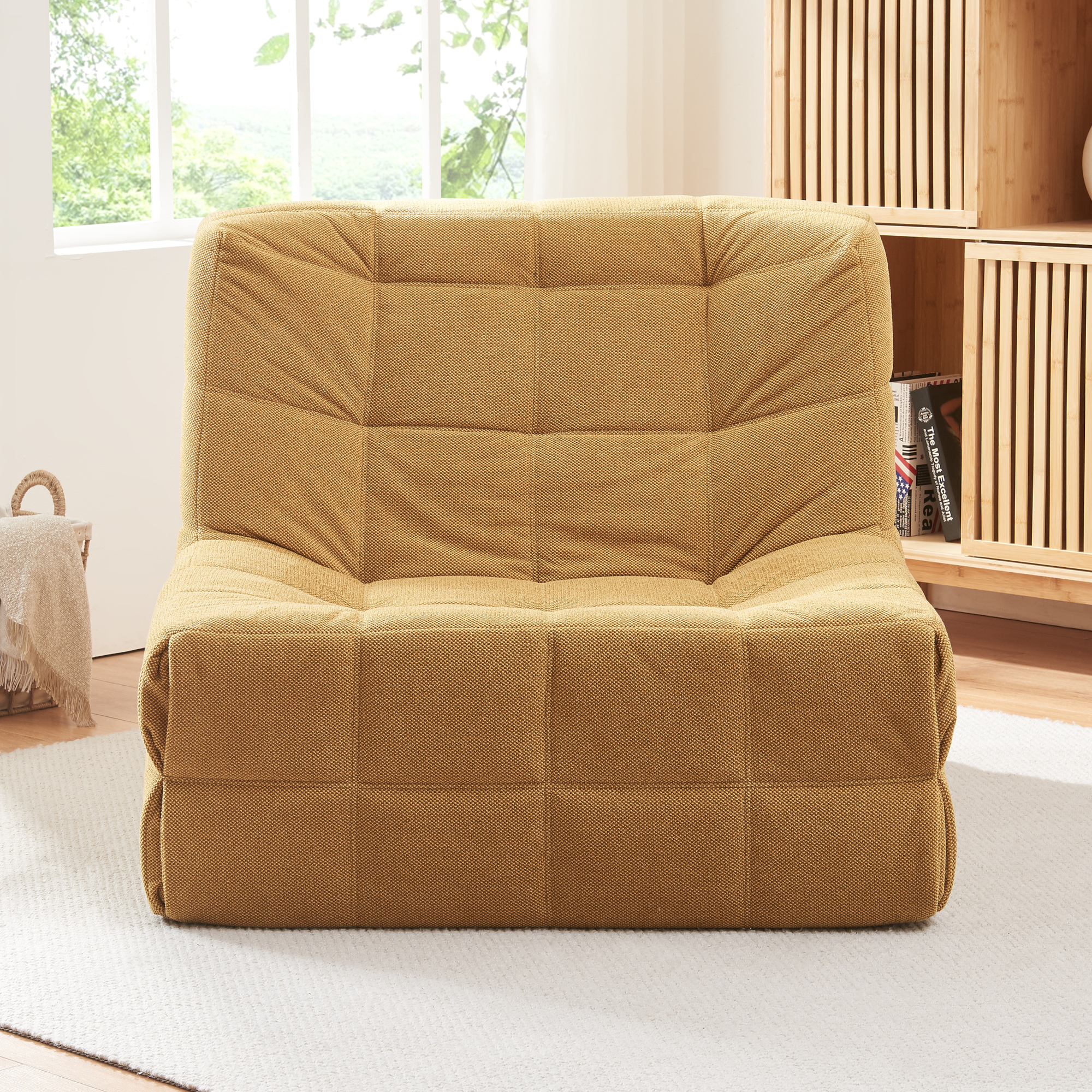 Fotoliul de podea Koskyvn este alegerea perfecta daca iti doresti un colt de relaxare confortabil si modern in living, dormitor sau camera de oaspeti. Cu un design placut si o nuanta calda de galben, acest fotoliu de podea galben aduce un plus de stil si confort in orice incapere.