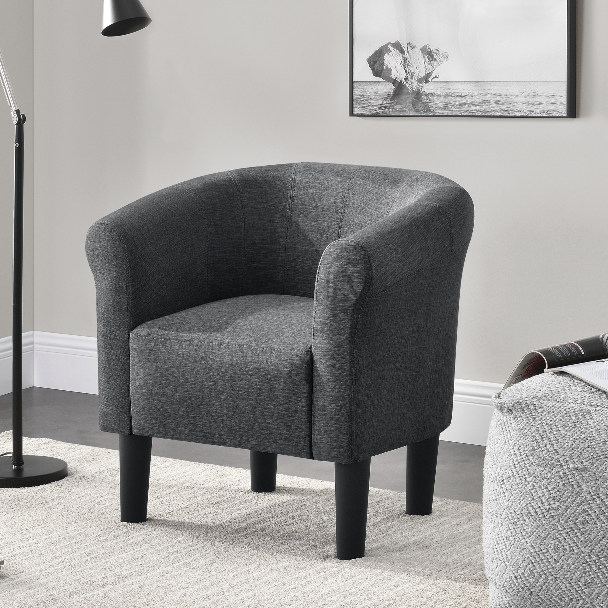 Fotoliul Jelgava este alegerea potrivită dacă îți dorești un loc comod de relaxare, cu un aspect modern și ușor de integrat în orice decor. Cu design elegant, linii rotunjite și tapițerie textilă în nuanță gri închis, acest fotoliu tapițat aduce un plus de stil în living, dormitor, birou sau zona de dining.