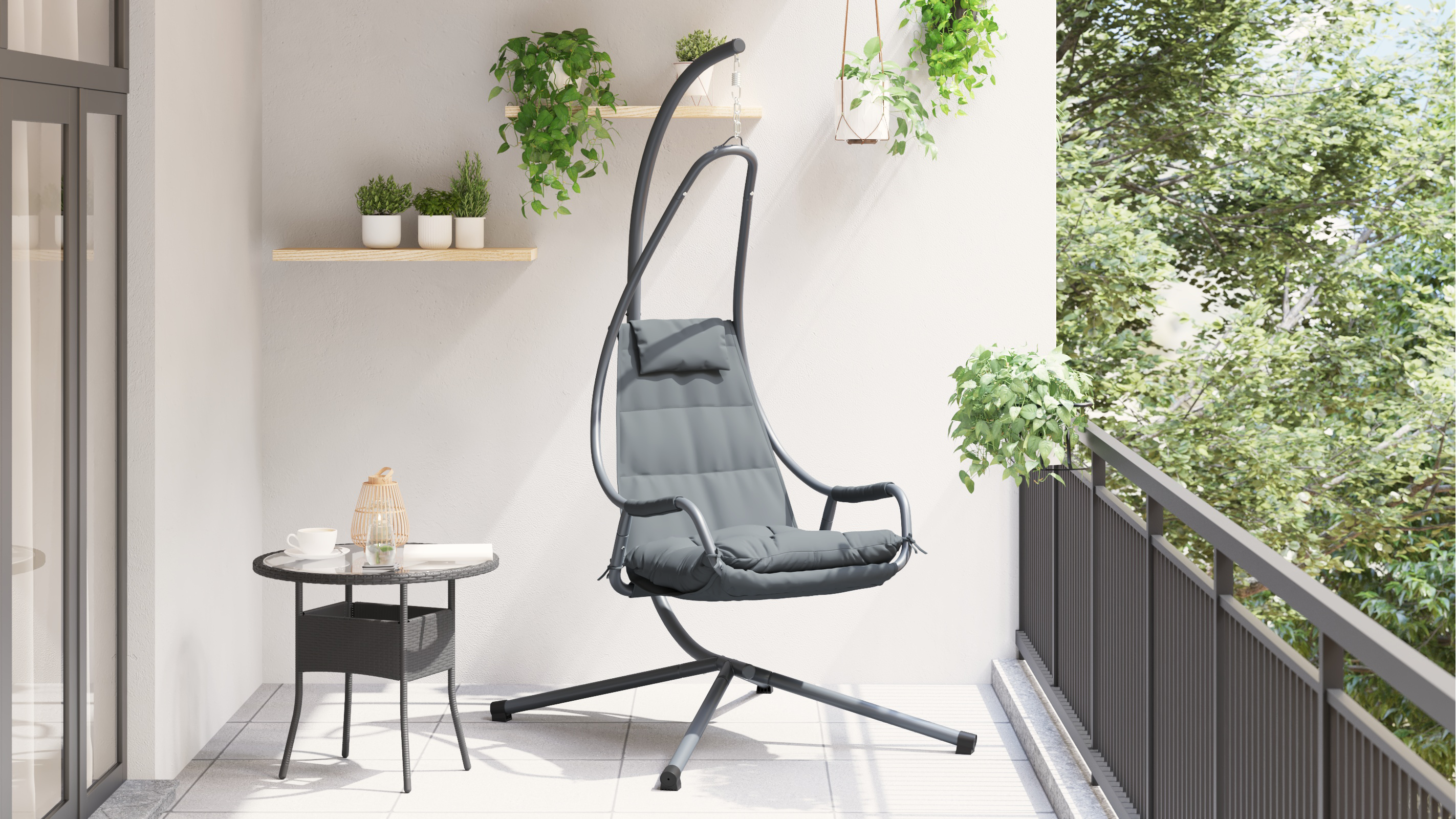 Fotoliul ăsta suspendat îmbină confortul cu stilul, perfect pentru relaxare pe balconul sau terasa ta. Are un cadru din oțel antracit și un șezut din țesătură care te face să te simți bine, ideal pentru serile calde de vară sau după-amiezile cozy de iarnă.