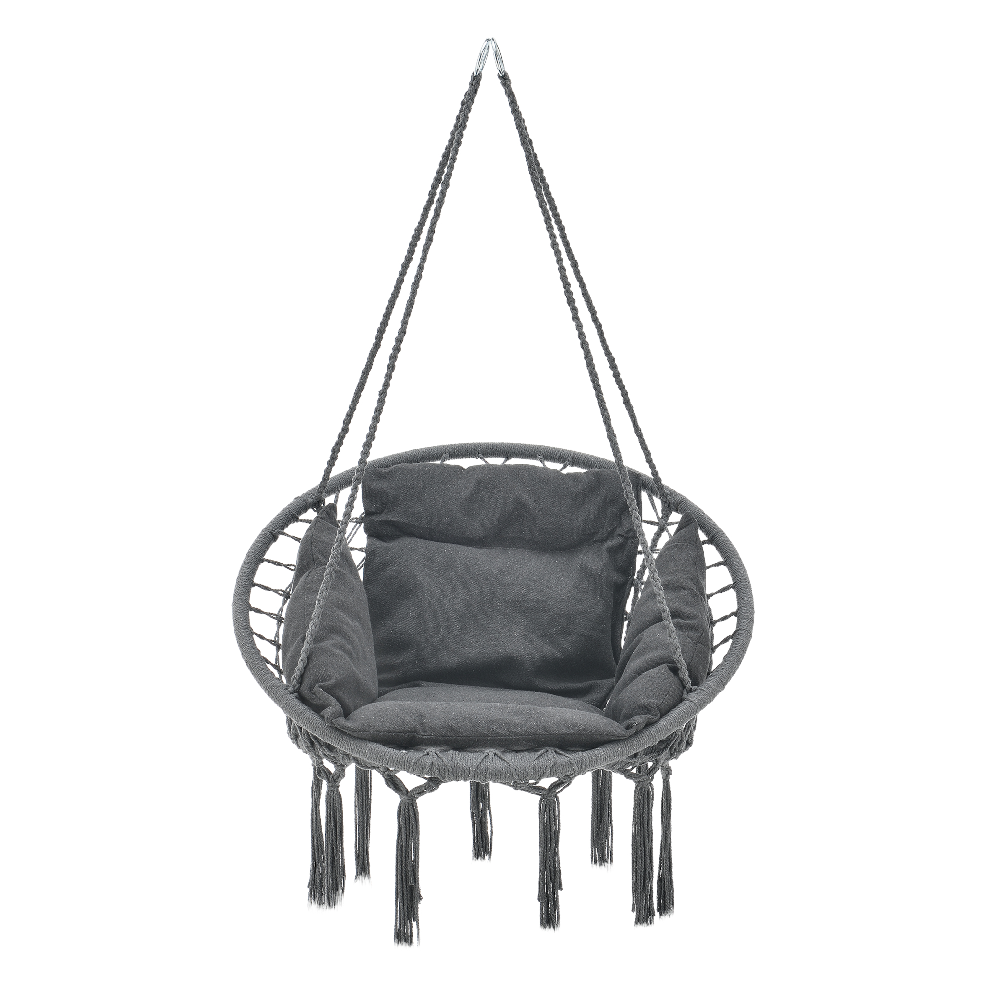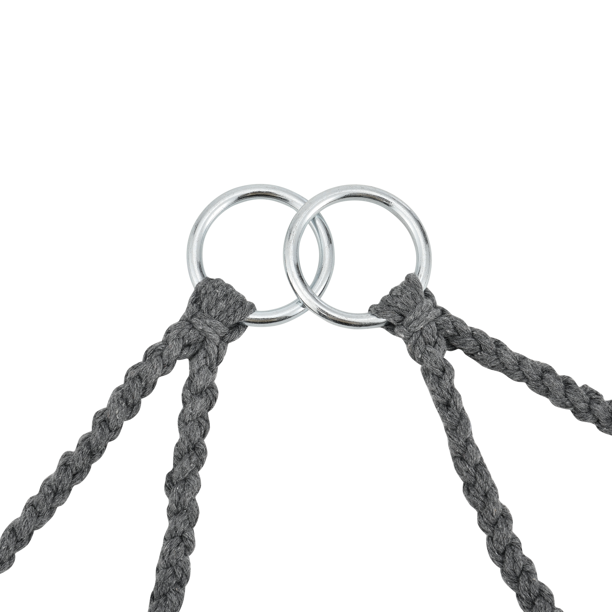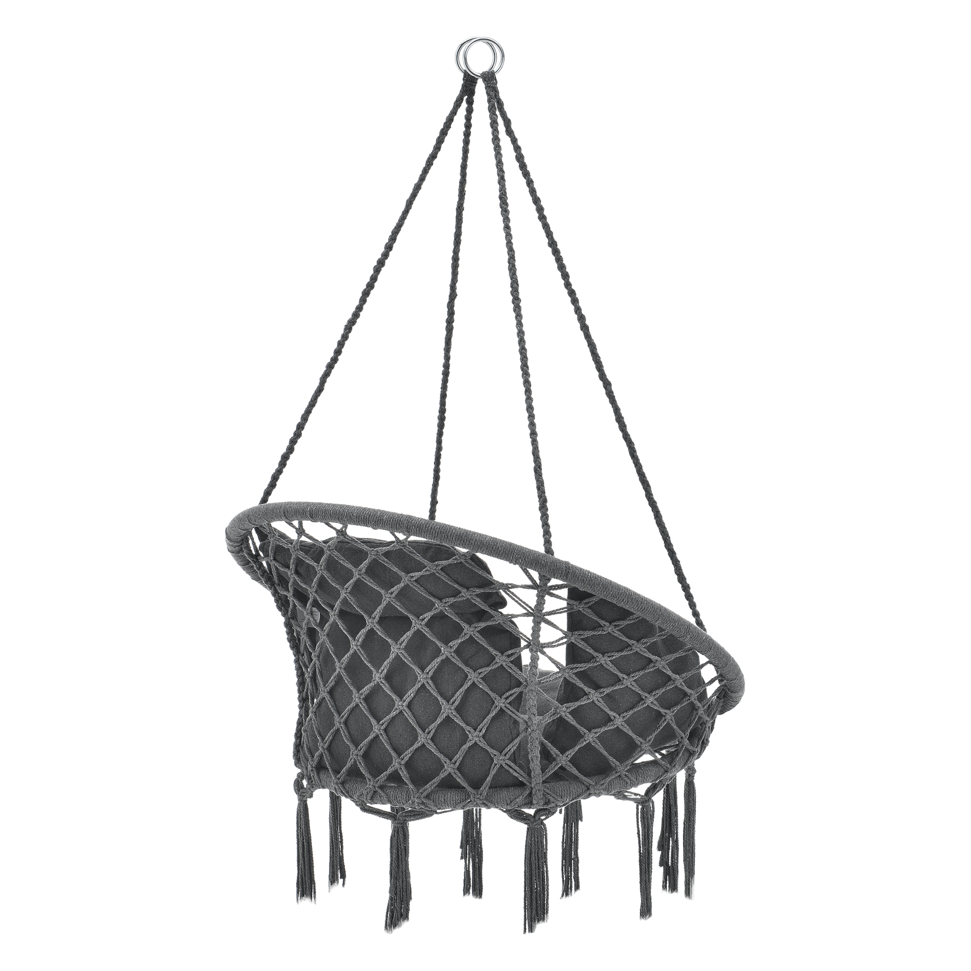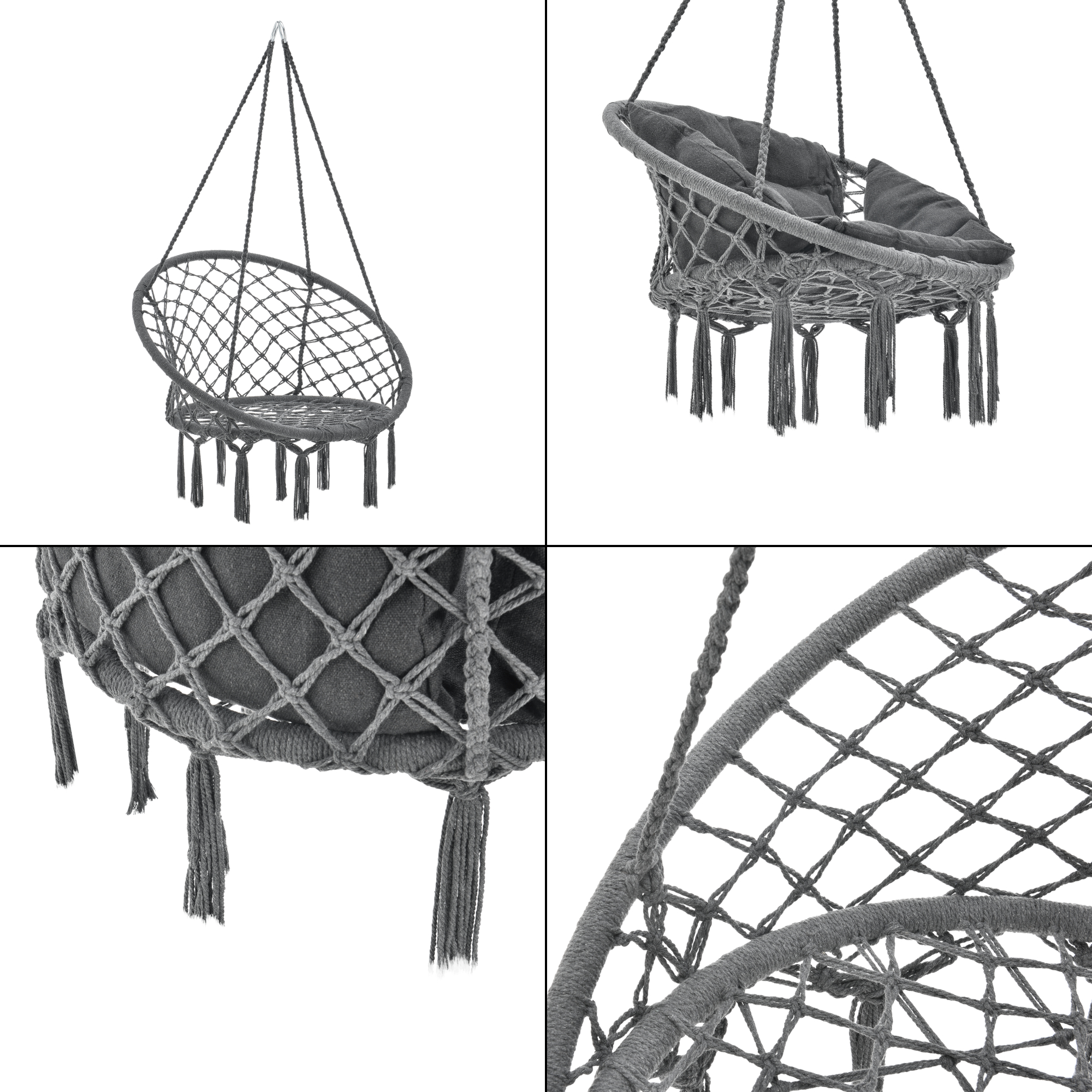 Potrivit atat pentru interior, cat si pentru exterior, modelul este usor de montat de tavan si ofera o sustinere sigura datorita celor 4 franghii conectate prin 2 inele din otel. Nuanța de gri inchis se integreaza usor in decoruri moderne, boeme sau minimaliste.