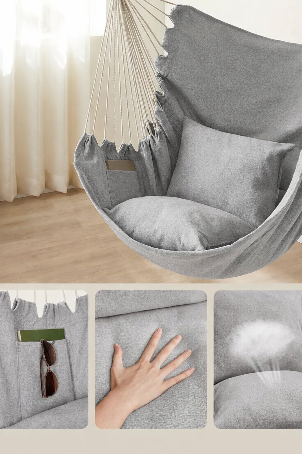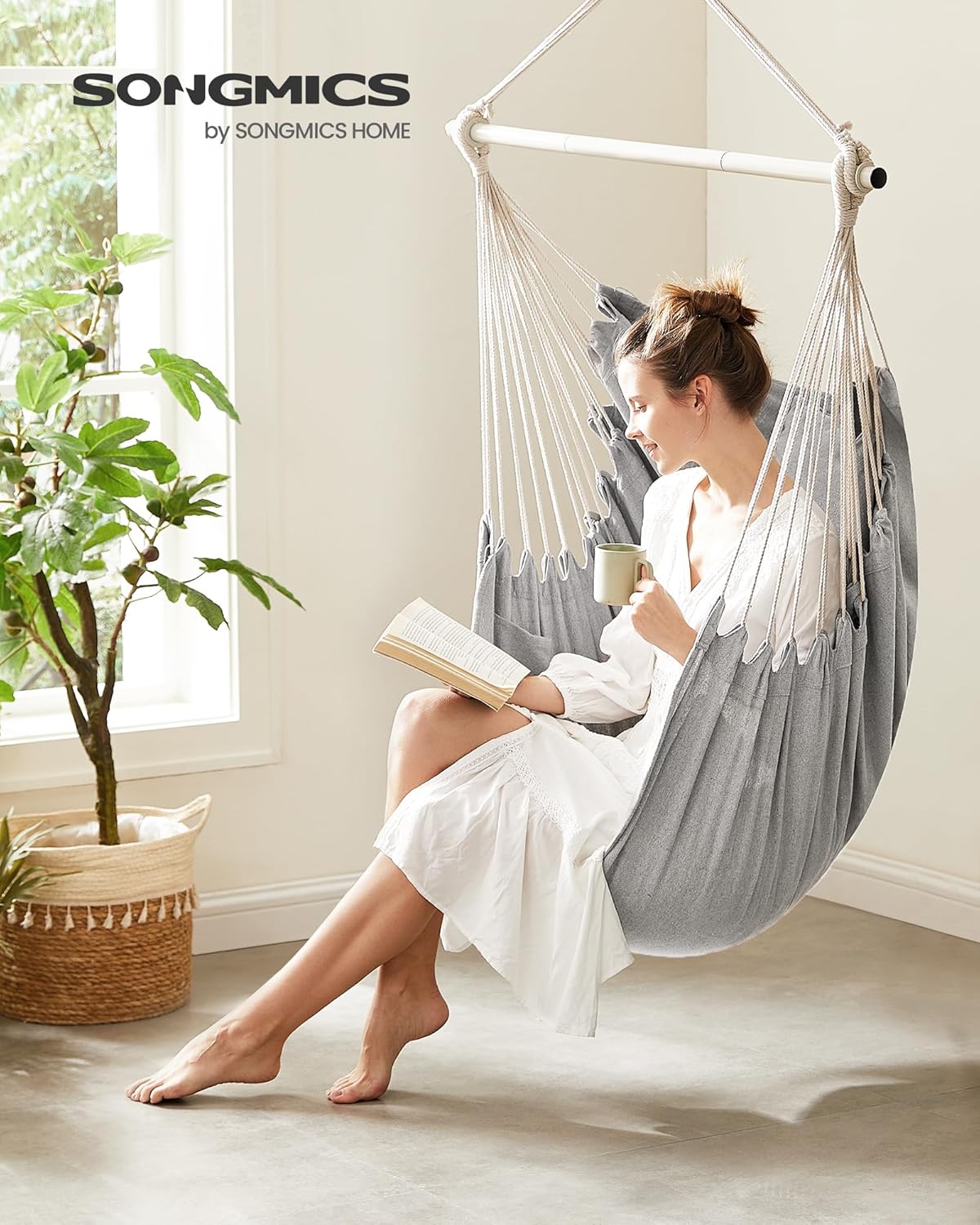 Bucura-te de momente de relaxare oriunde alegi cu acest fotoliu suspendat tip hamac SONGMICS, creat pentru confort acasa sau in aer liber. Designul modern, in nuanta gri, se integreaza usor pe balcon, terasa, in living sau dormitor. Cele 2 perne moi, materialul respirabil din policoton si bara metalica rezistenta transforma acest scaun suspendat intr-un loc perfect pentru citit, odihna sau pauze de relaxare.