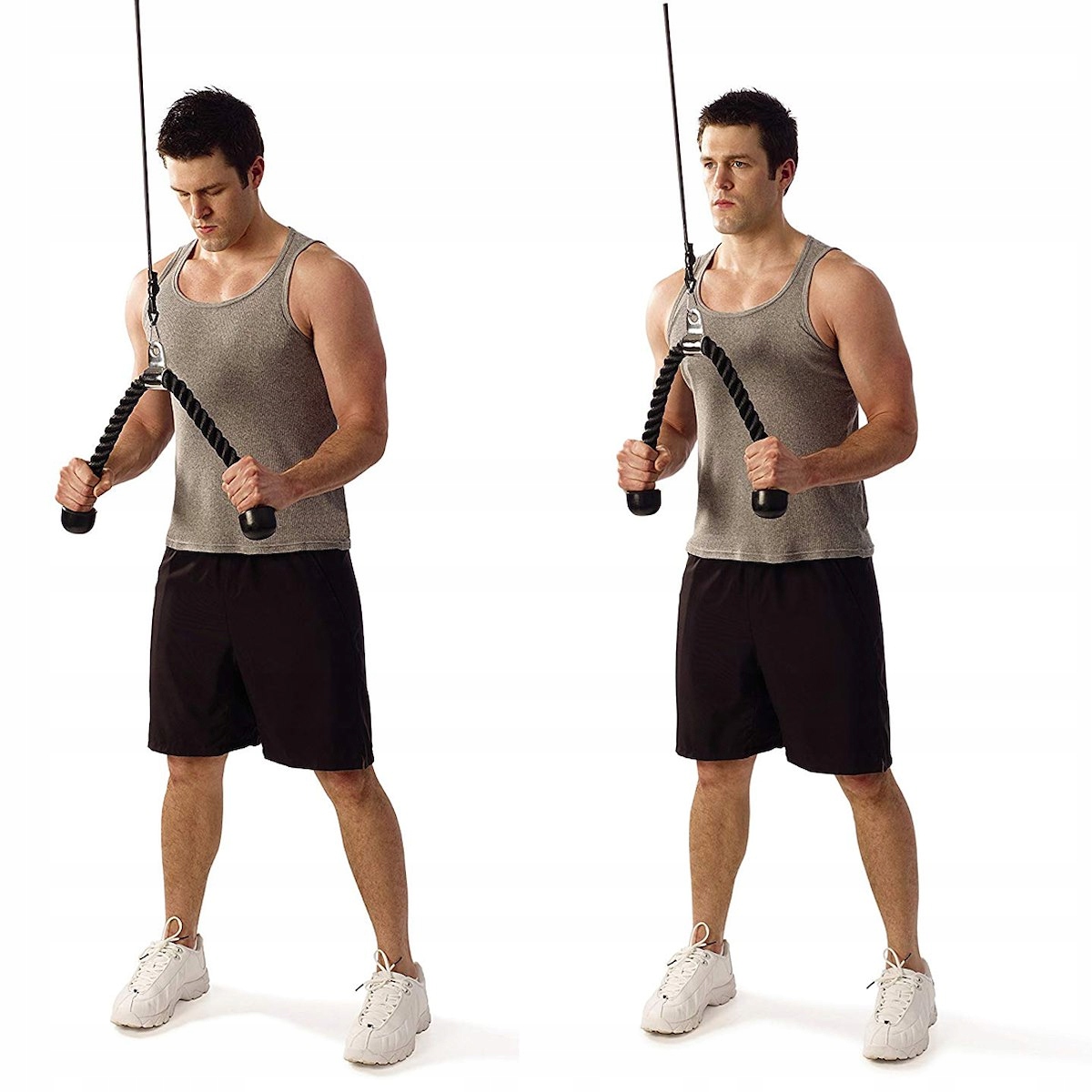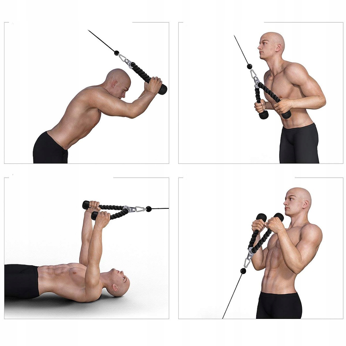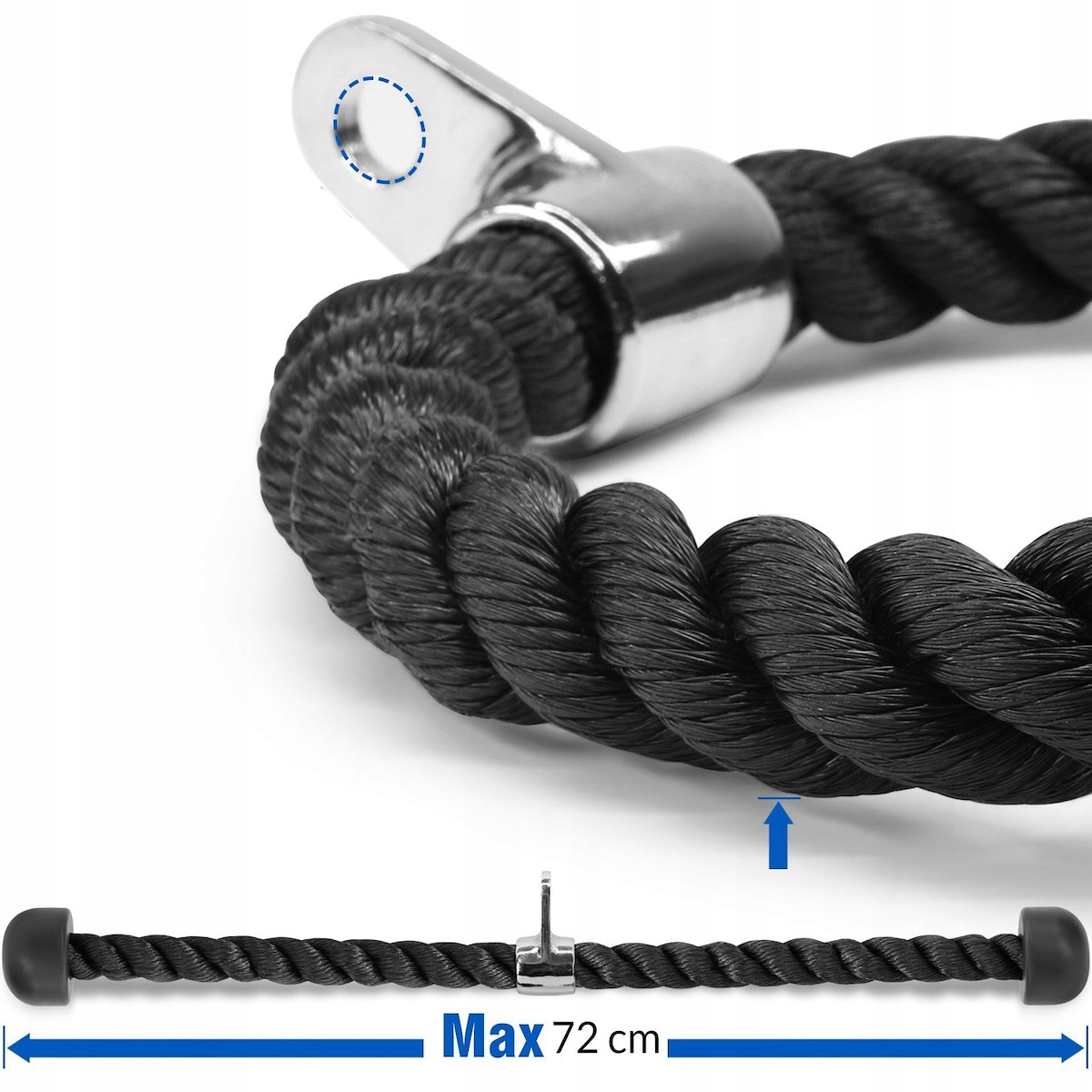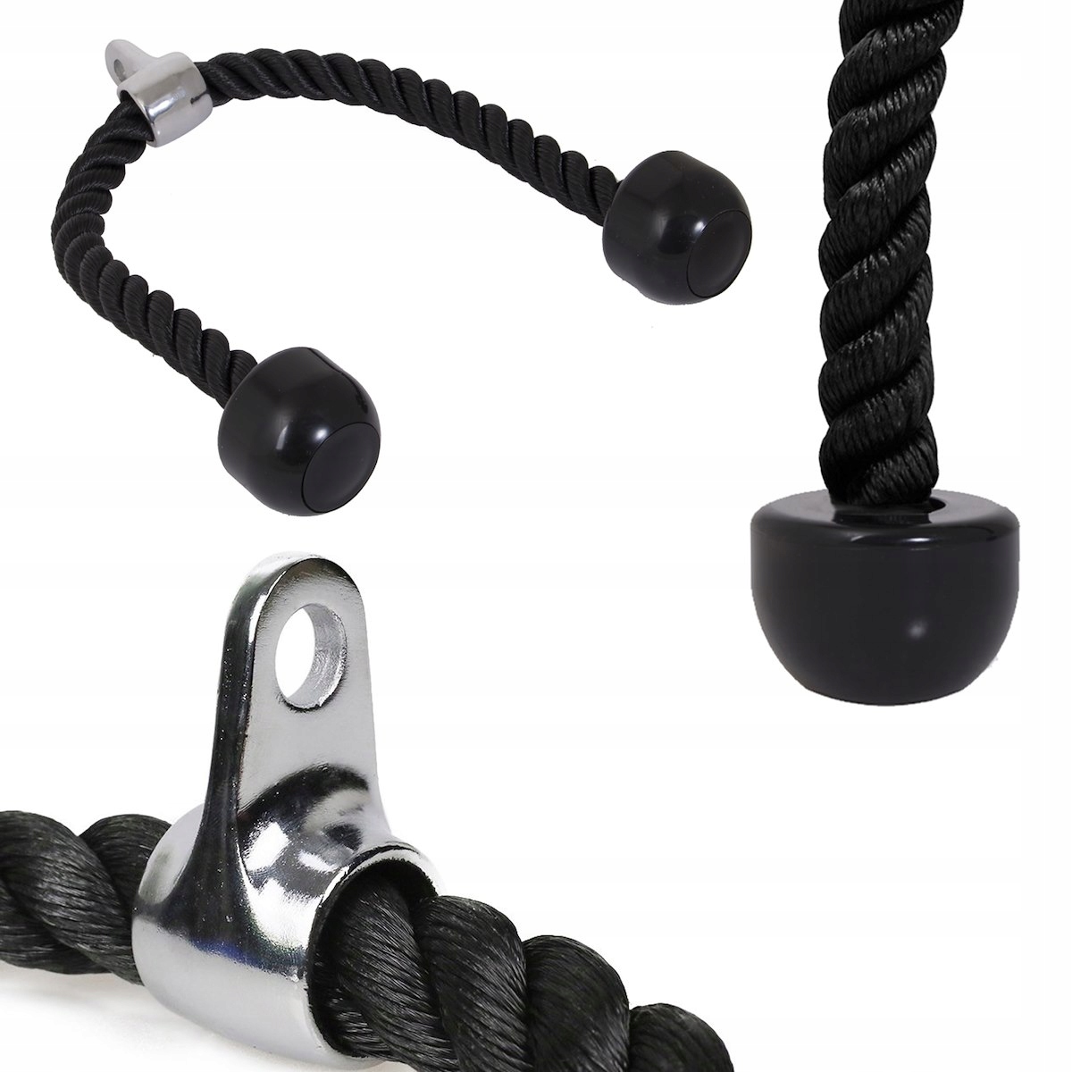 Utilizare: atașează frânghia la aparatul cu scripete/helcometru și folosește-o pentru extensii triceps, face pulls sau alte exerciții pentru partea superioară a corpului. Este recomandată pentru antrenamente controlate, cu execuție corectă și priză fermă.