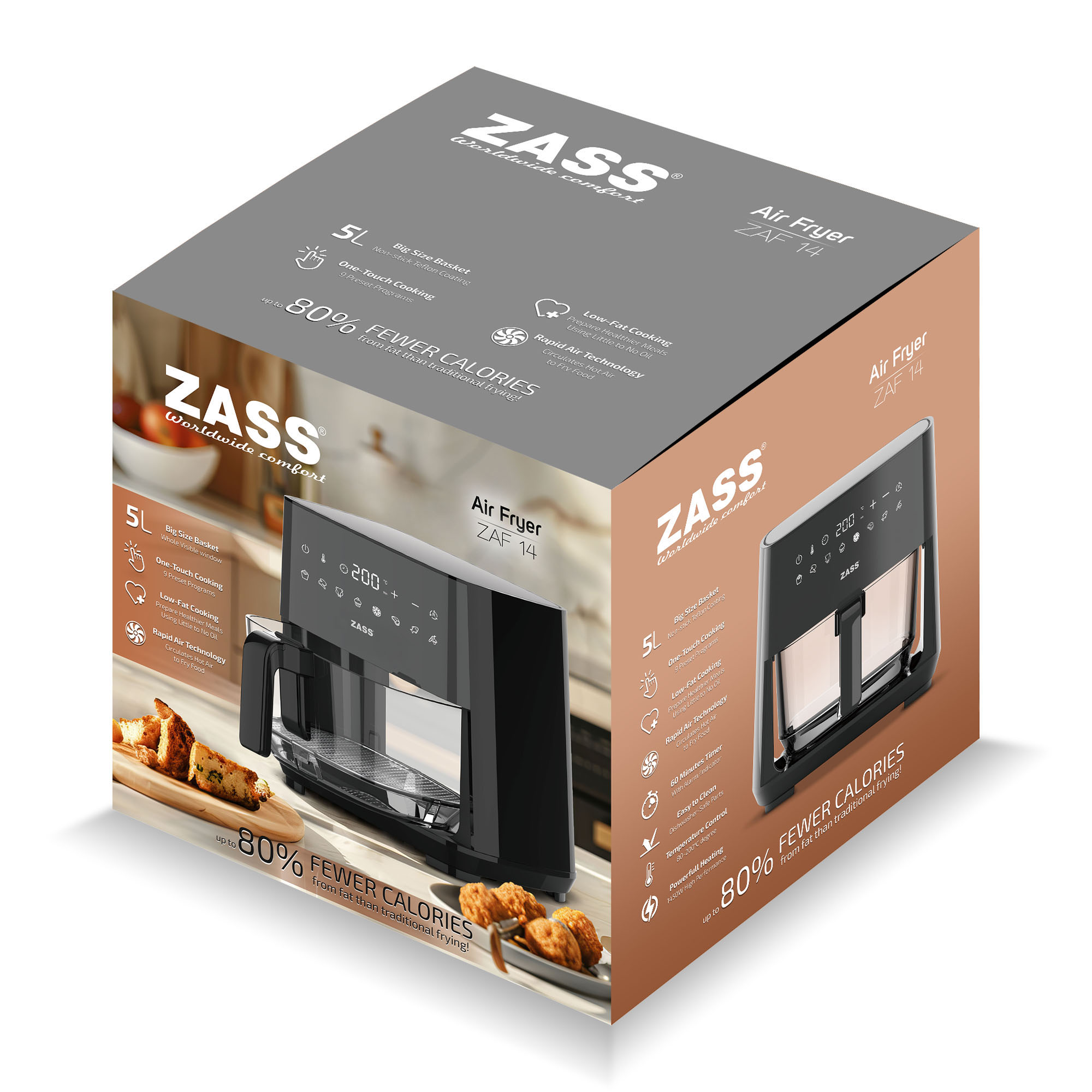 Descoperă friteuza cu aer cald ZASS ZAF 14, alegerea ideală pentru mese gustoase și mai sănătoase, pregătite rapid și cu foarte puțin ulei sau chiar deloc. Cu un coș din sticlă de 5 litri, control digital și 9 programe presetate, acest air fryer ZASS îți oferă confort, vizibilitate excelentă în timpul gătirii și rezultate uniforme pentru o varietate de preparate.
