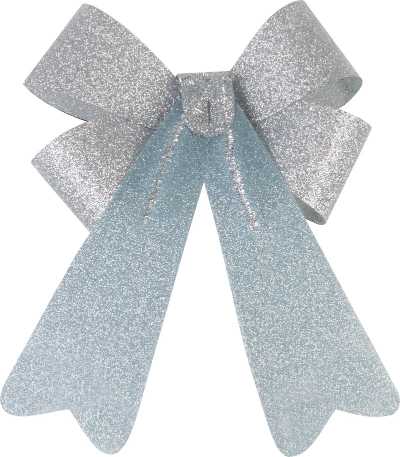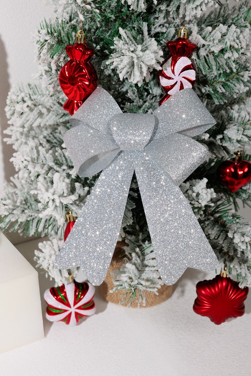 Fundă decorativă de Crăciun, argintie, cu efect strălucitor, ideală pentru coronițe, ghirlande și aranjamente festive. Dimensiunea de 13x21 cm o face ușor de integrat în decorul casei, adăugând un accent elegant și luminos sărbătorilor de iarnă.