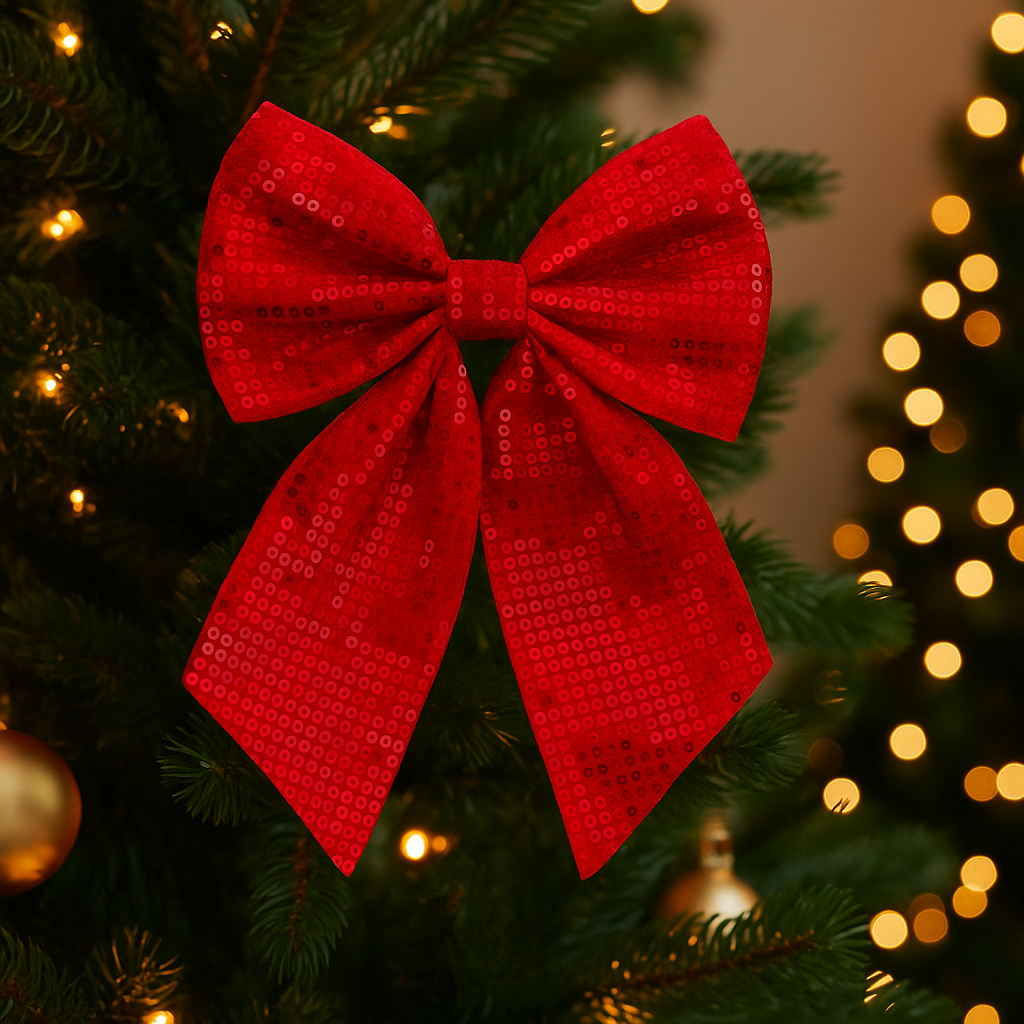 Adauga un plus de farmec decorului festiv cu aceasta fundita decorativa pentru bradul de Craciun, realizata intr-o nuanta intensa de rosu si finisata cu paiete stralucitoare. Este alegerea perfecta pentru cei care vor sa creeze un ambient elegant si vesel, fie ca impodobesc bradul, o coronita sau diverse aranjamente de Craciun. Textura lucioasa reflecta frumos lumina si scoate decorul in evidenta.