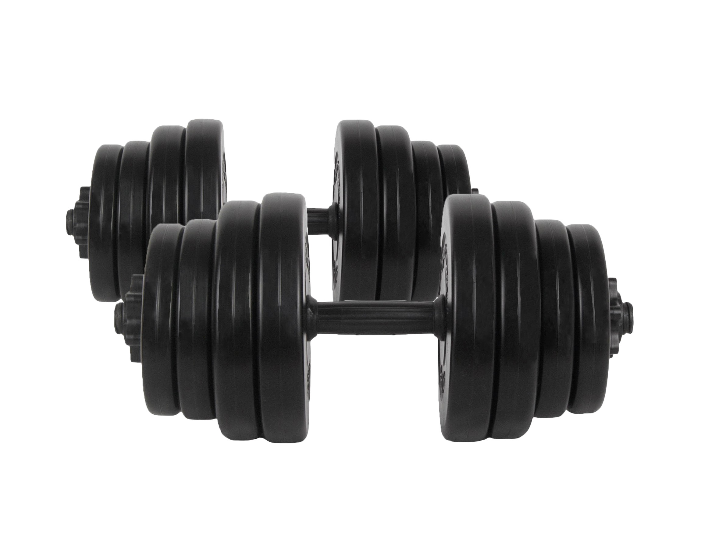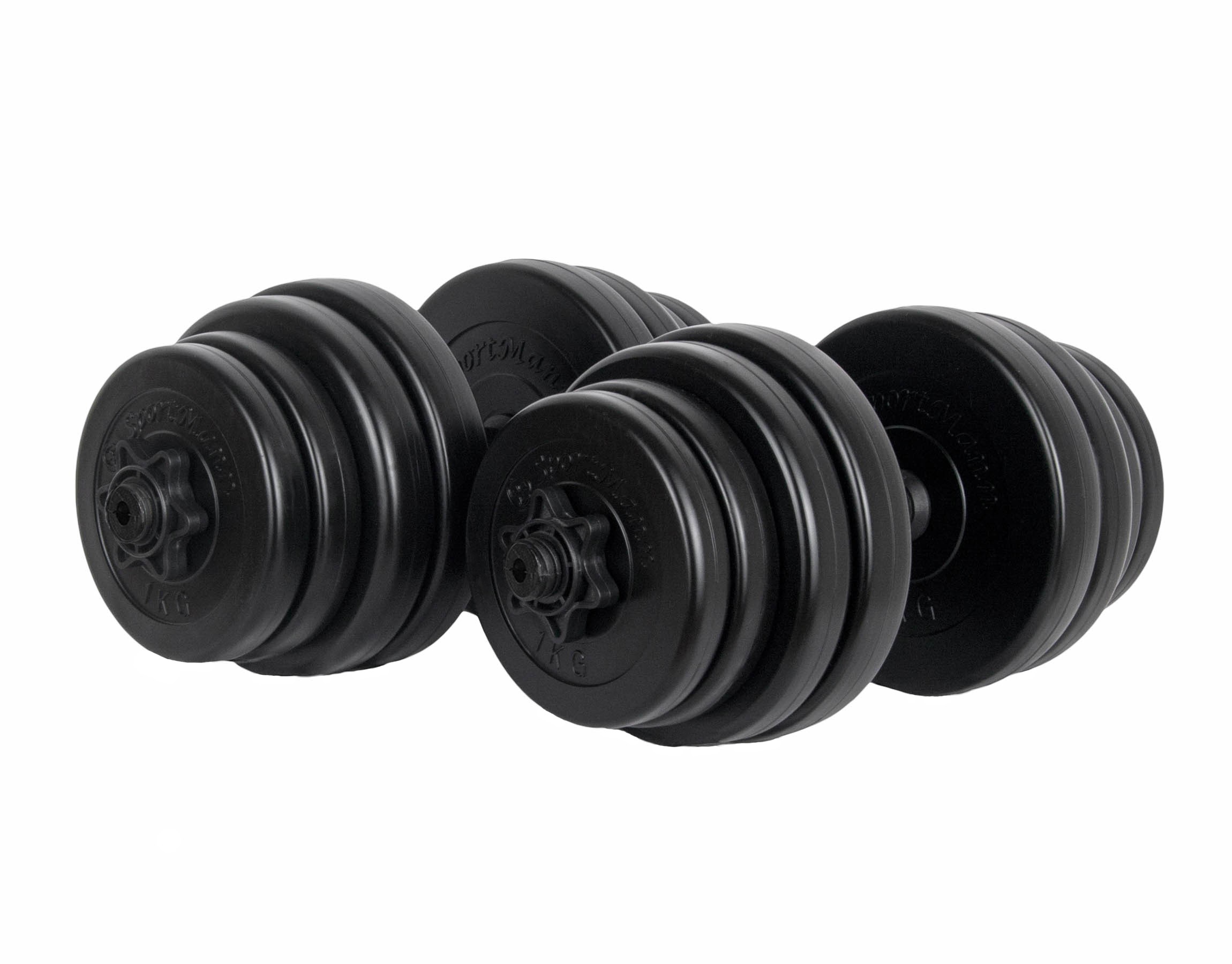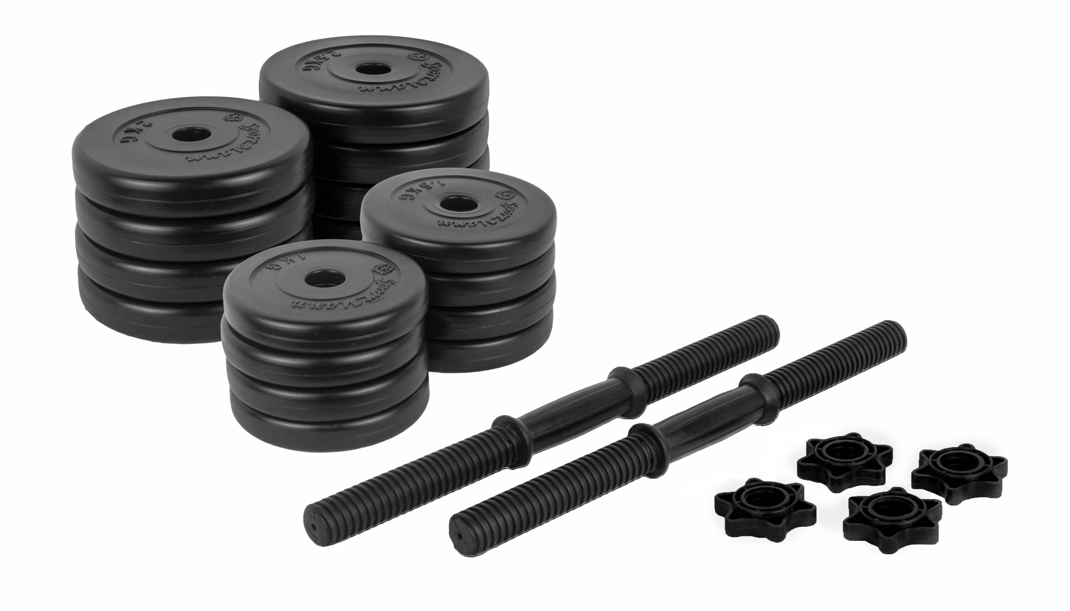 Setul de gantere 2x15 kg de la Sportmann contine: 4 discuri de 2,5 kg, 4 discuri de 2 kg, 4 discuri de 1,5 kg, 4 discuri de 1kg, 2 bare si 4 sigurante. Discurile sunt fabricate din PVC rezistent la uzura si sunt umplute cu ciment. Barele sunt prevazute cu manere aderente pentru stabilitate inalta in timpul exercitiilor. Sigurantele cu filet sunt usor de utilizat si impiedica alunecarea discurilor de pe bara. Ganterele PVC cu ciment 2x15kg sunt potrivite pentru antrenarea eficienta a musculaturii superioare a corpului acasa sau la sala.