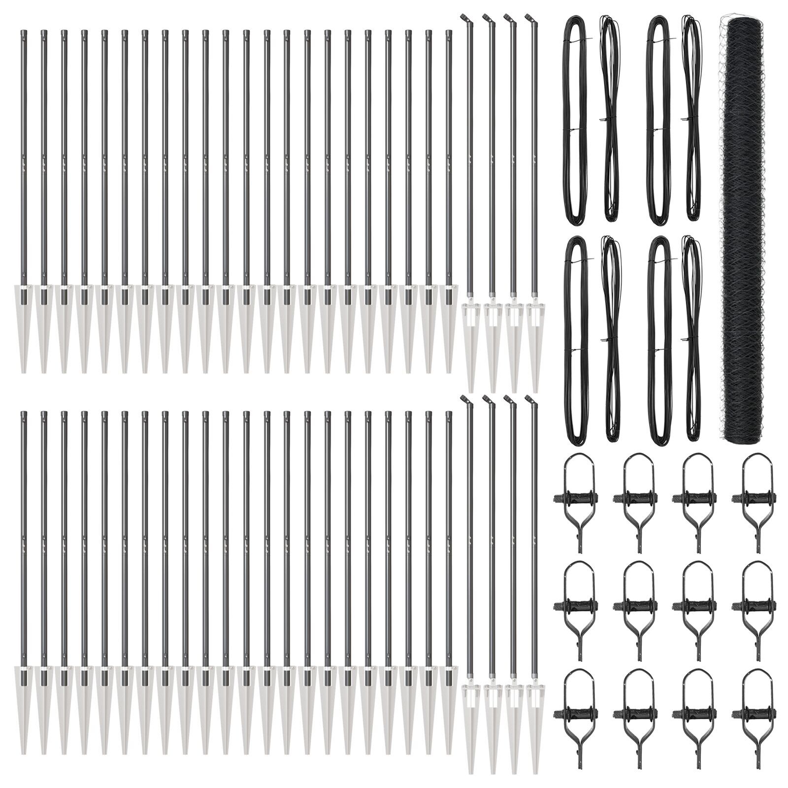 - Kit Complet: Setul ăsta de gard include tot ce îți trebuie – stâlpi de gard, plasă, ancora cu spike și cabluri – oferindu-ți o soluție completă pentru toate nevoile tale de gard.