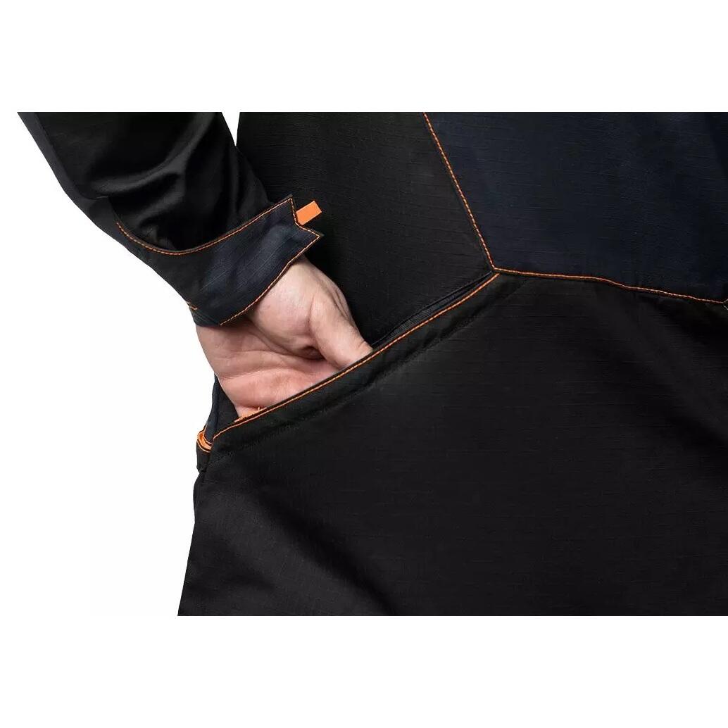 Geaca de lucru are un set de buzunare practice: doua buzunare pe umar (pentru pix, lanterna sau surubelnita), doua buzunare la piept (cu butoane), buzunare laterale incapatoare (cu fermoar) si doua buzunare pe spate (cu fermoare si intarite suplimentar cu material Oxford).