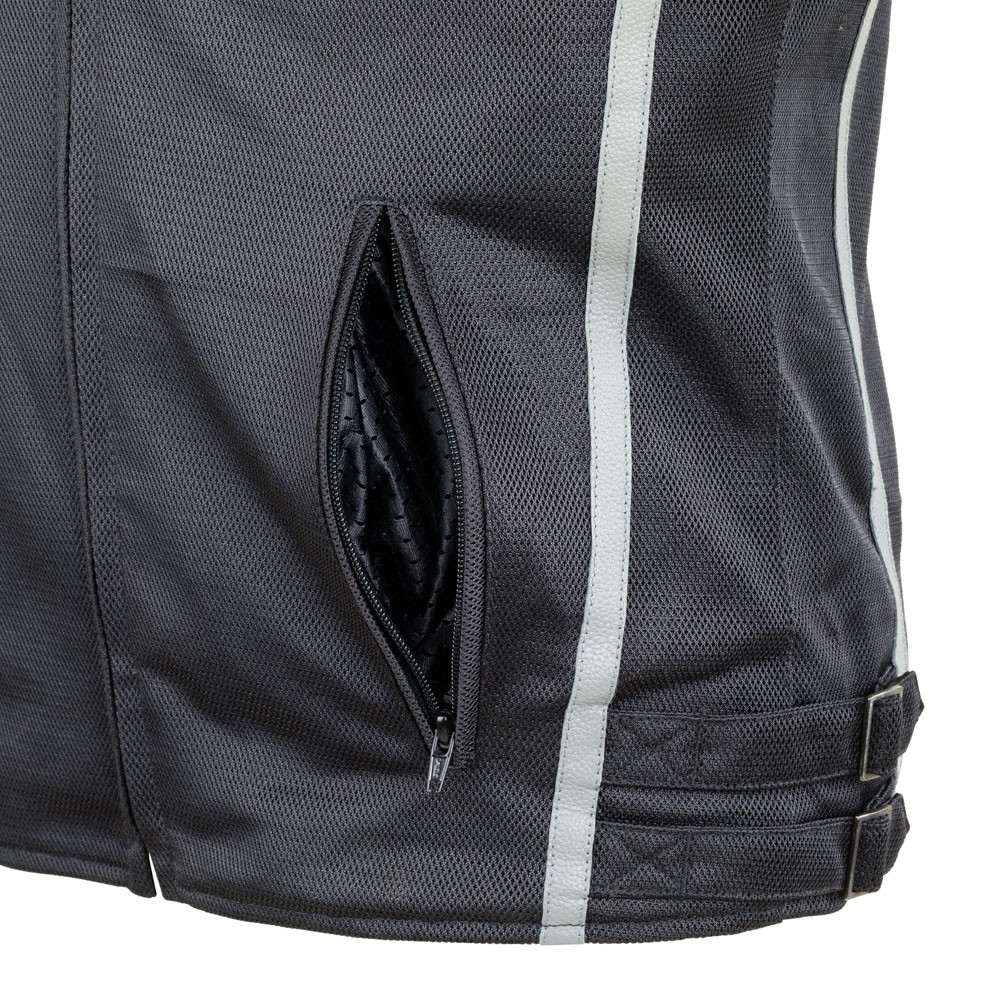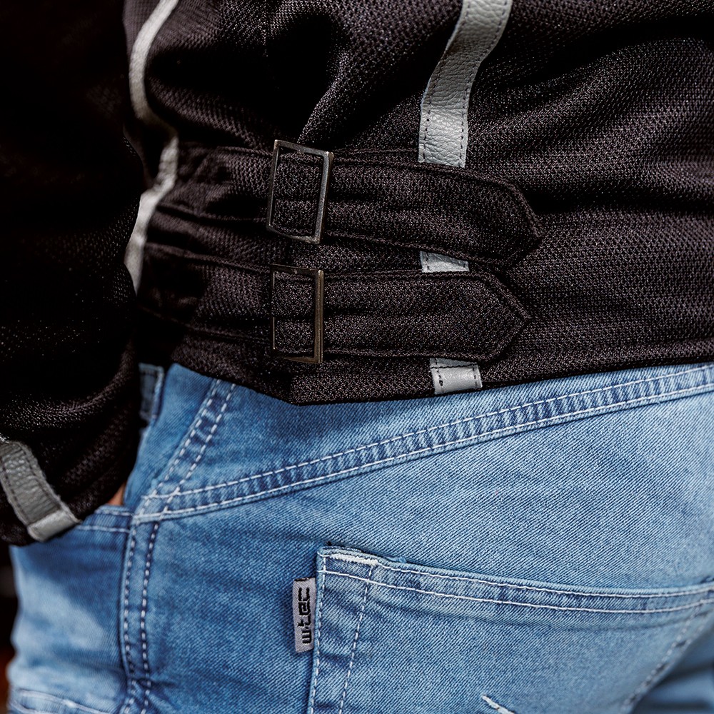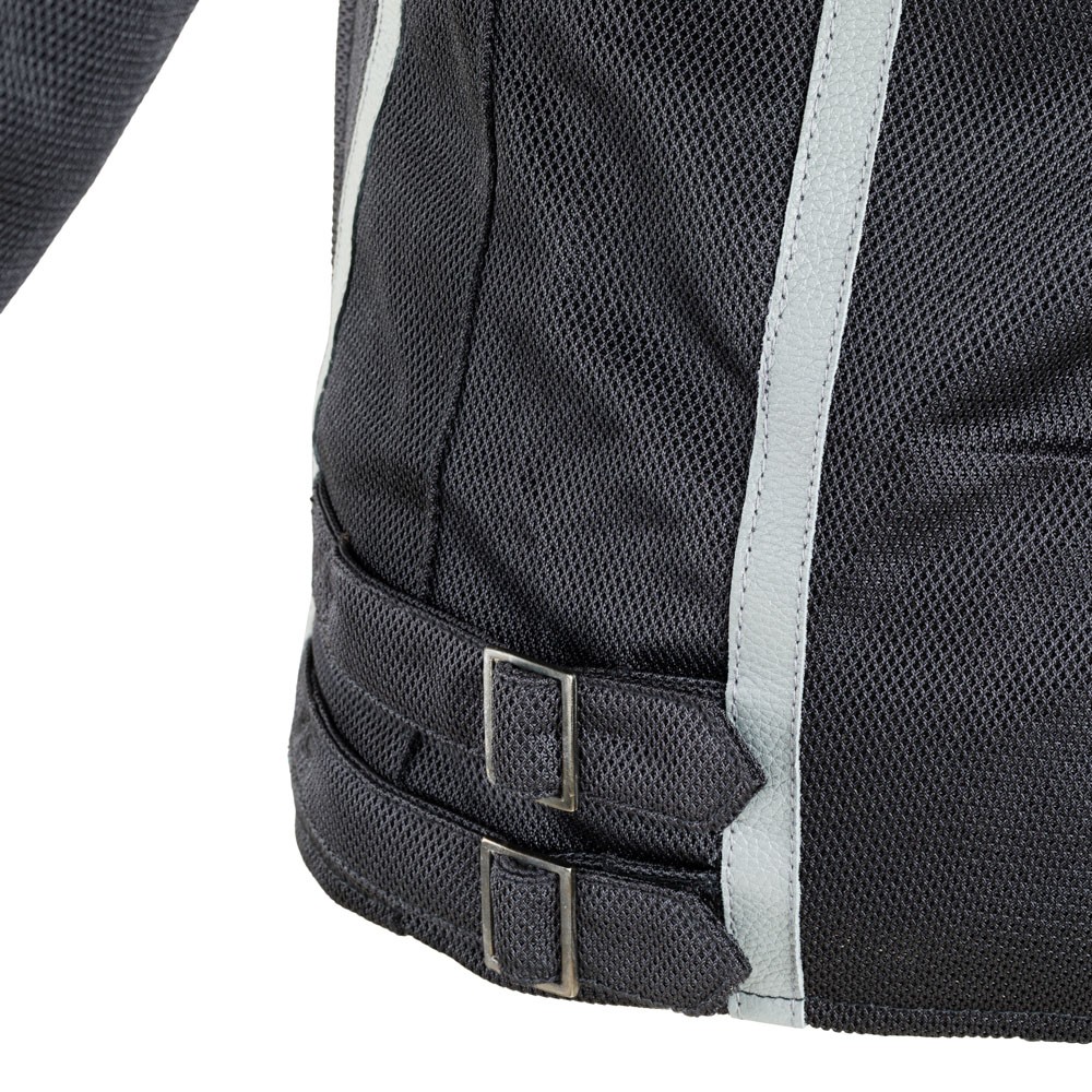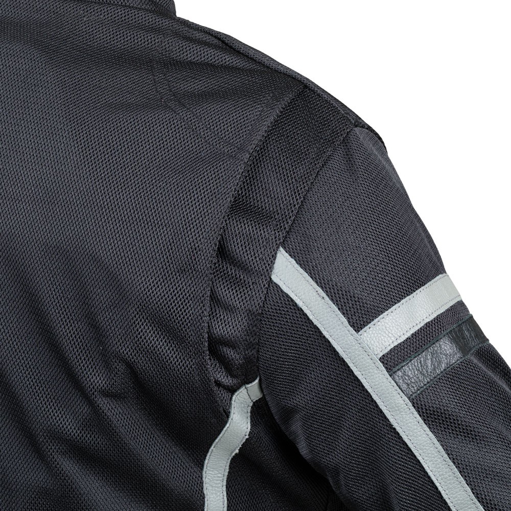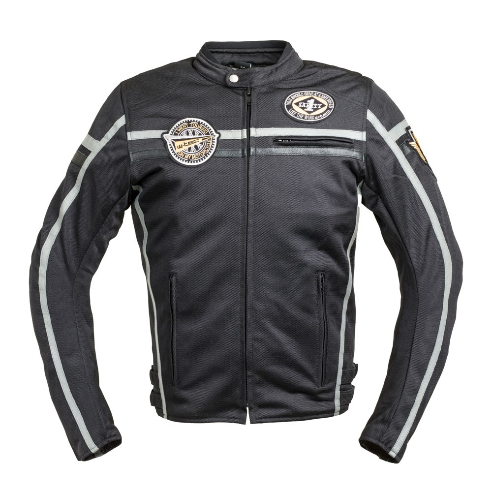 Aceasta geaca cu petice, in stil vintage, arata ca o jacheta din piele, dar este confectionata in cea mai mare parte din plasa respirabila care permite aerului sa patrunda in ea, mentinand motociclistul aerisit in zilele fierbinti de vara. Cu toate acestea, geaca are cateva elemente din piele, cum ar fi dungile si tivurile decorative.