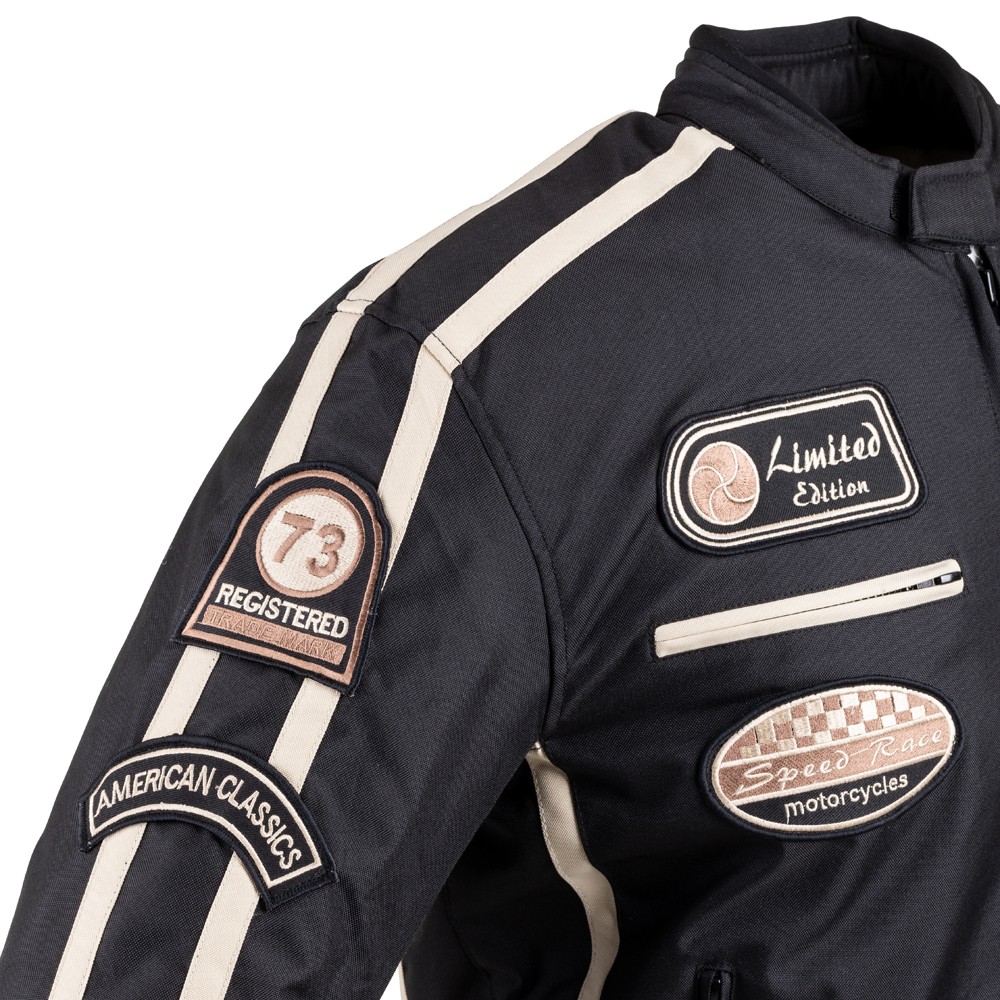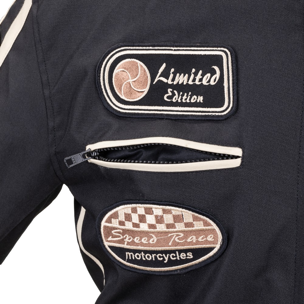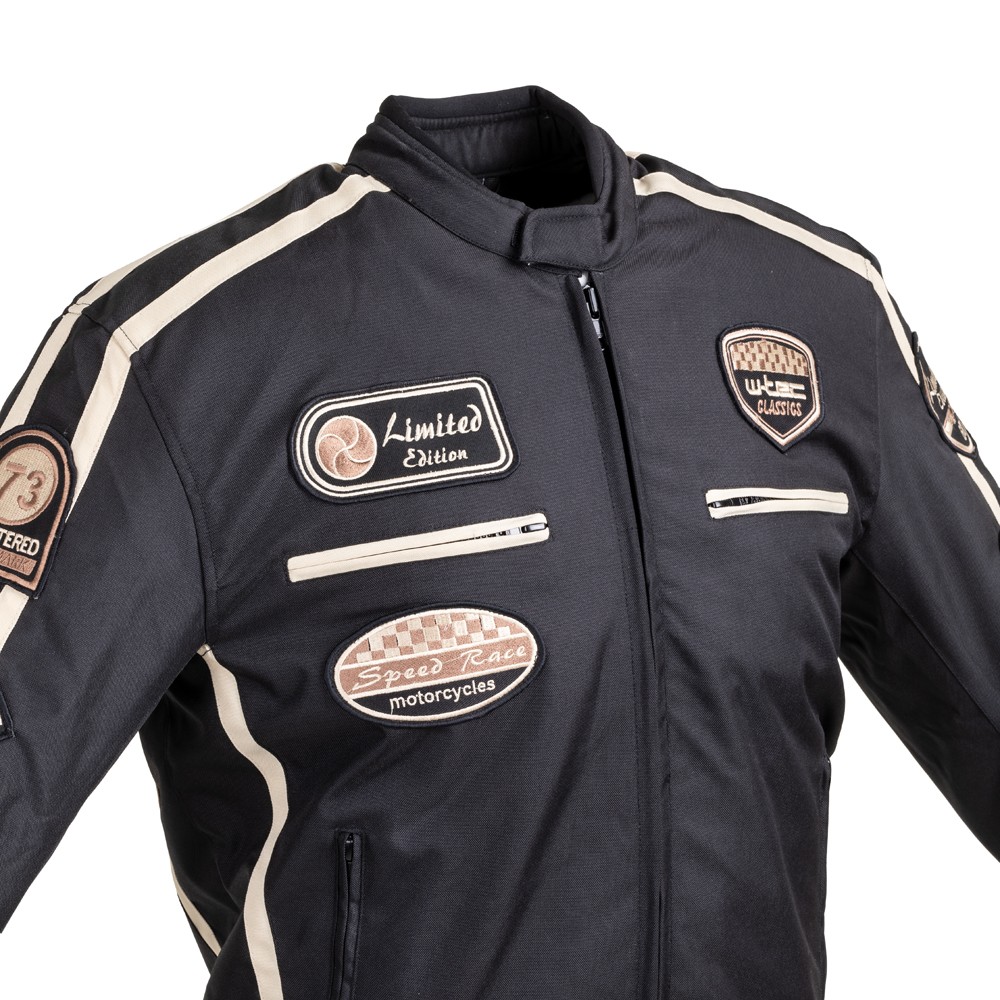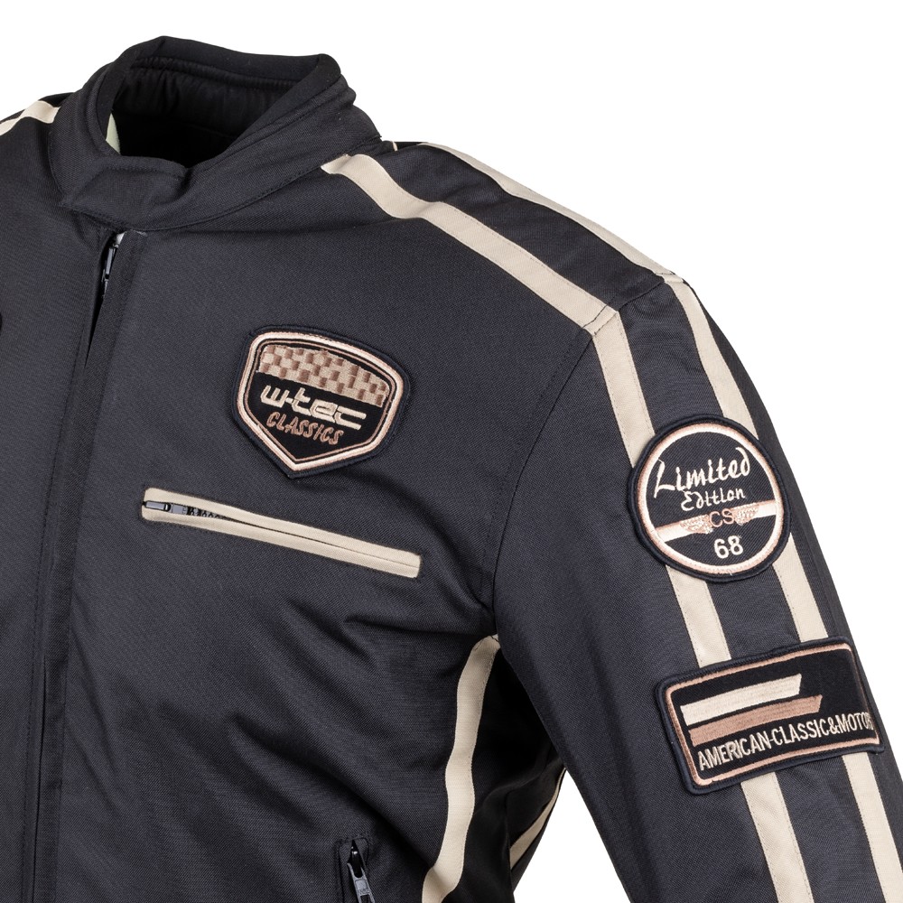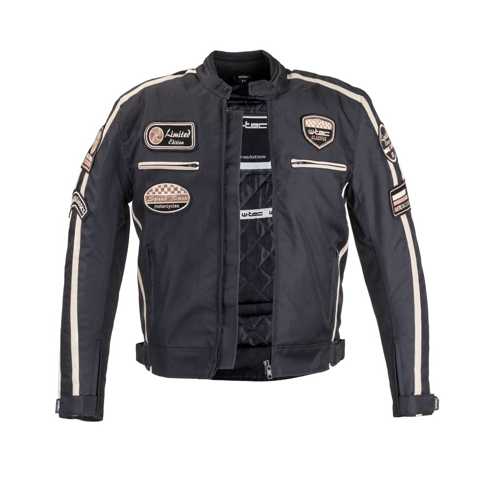 Geaca Moto de Barbati W-TEC Patriot va poate surprinde la inceput. Chiar daca este o jacheta din poliester, imita aspectul jachetelor de piele cu patch-uri. Si comparativ cu jachetele de piele, ofera numeroase avantaje: este mai usoara, poate fi spalat, nu necesita intretinere (nu este necesara ceruire) si, nu in ultimul rand, este mult mai ieftina.