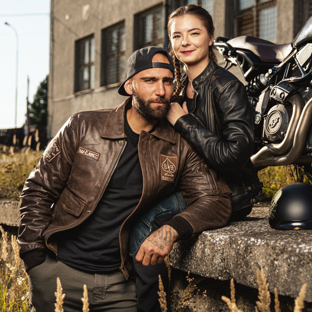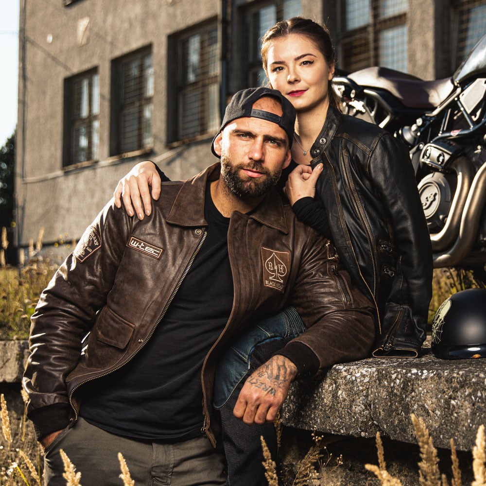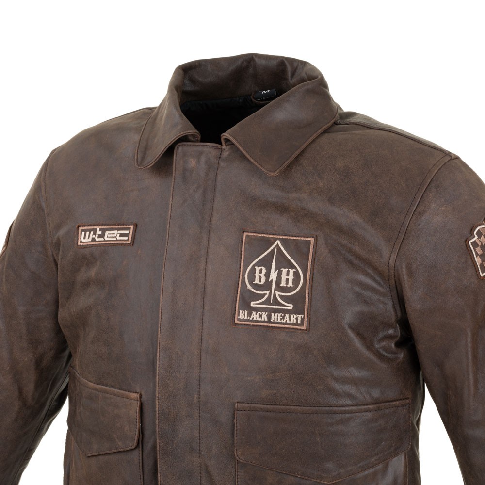 Imprimeul cusut, in stil motociclist, semnele verbale si logo-ul mare de pe spate completeaza designul Geaca Moto din Piele pentru Barbati W-TEC Black Heart Bomber si o fac sa para cu adevarat rezistenta.