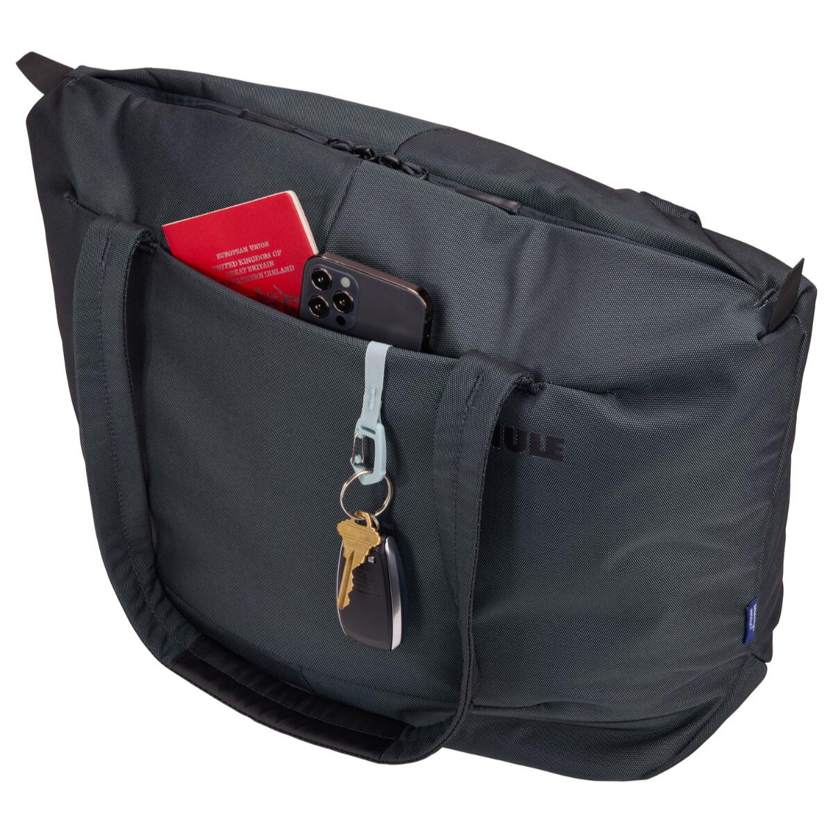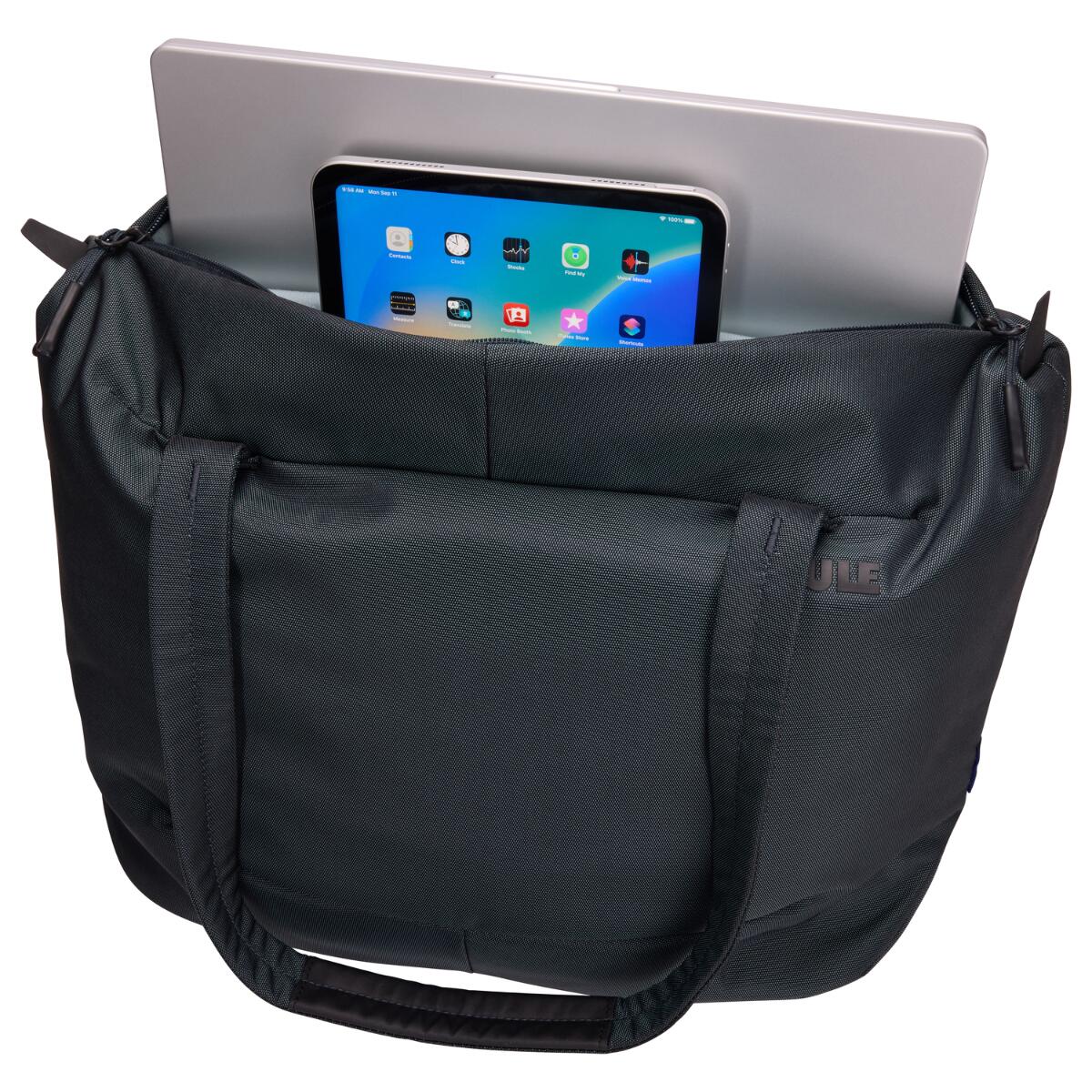 Geanta de umar Thule Subterra 2 Tote Bag 22L, gri inchis, este alegerea ideala pentru birou si calatorii. Include compartiment captusit pentru laptop de 16 inch si tableta, buzunare inteligente pentru organizare, prindere pe troler si material rezistent la apa.
