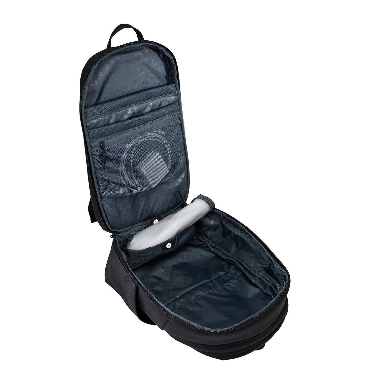 Modelul se extinde de la 28L la 32L, oferind cu aproximativ 15% mai mult spațiu de împachetare atunci când ai nevoie. Separatorul din TPU, ușor de curățat, ajută la separarea hainelor sau echipamentelor umede de restul conținutului, iar compartimentul căptușit protejează un laptop de până la 15,6 inch sau un MacBook de 16 inch, plus o tabletă de 12,9 inch. Materialul exterior din pânză cerată 600D este rezistent la apă și uzură, fiind realizat din poliester reciclat.