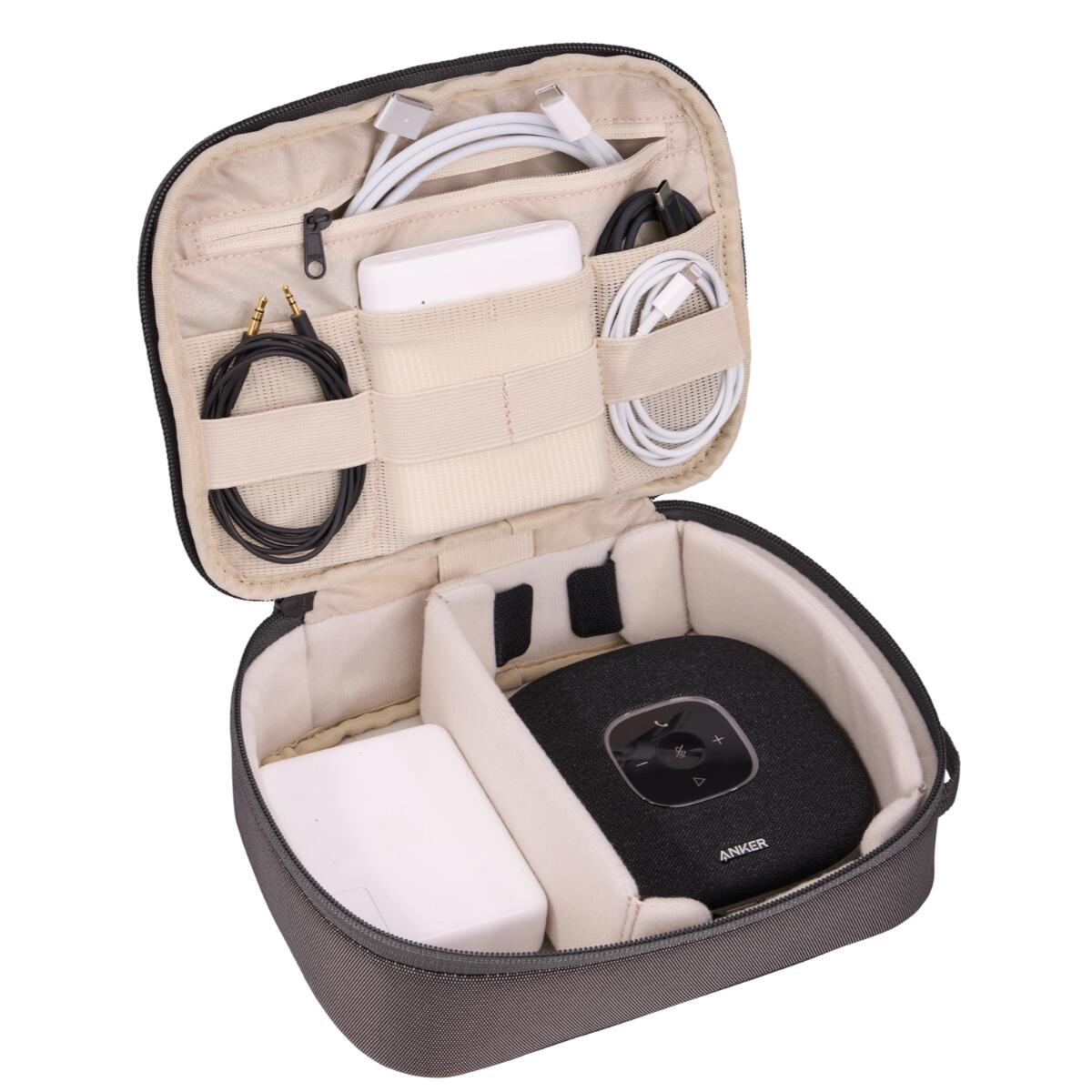 - Organizează eficient cabluri, adaptoare, căști și accesorii mici