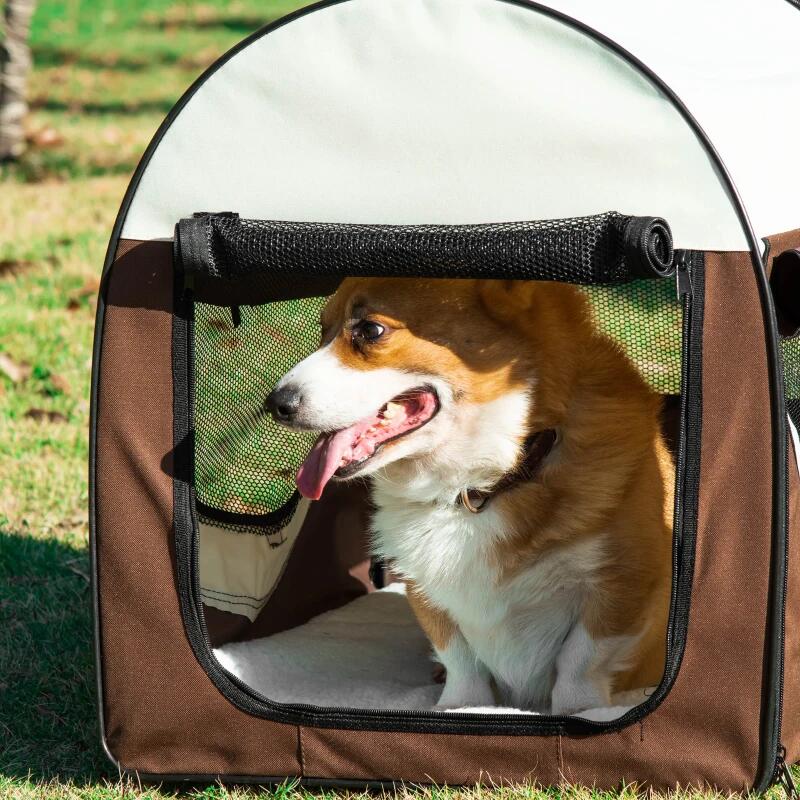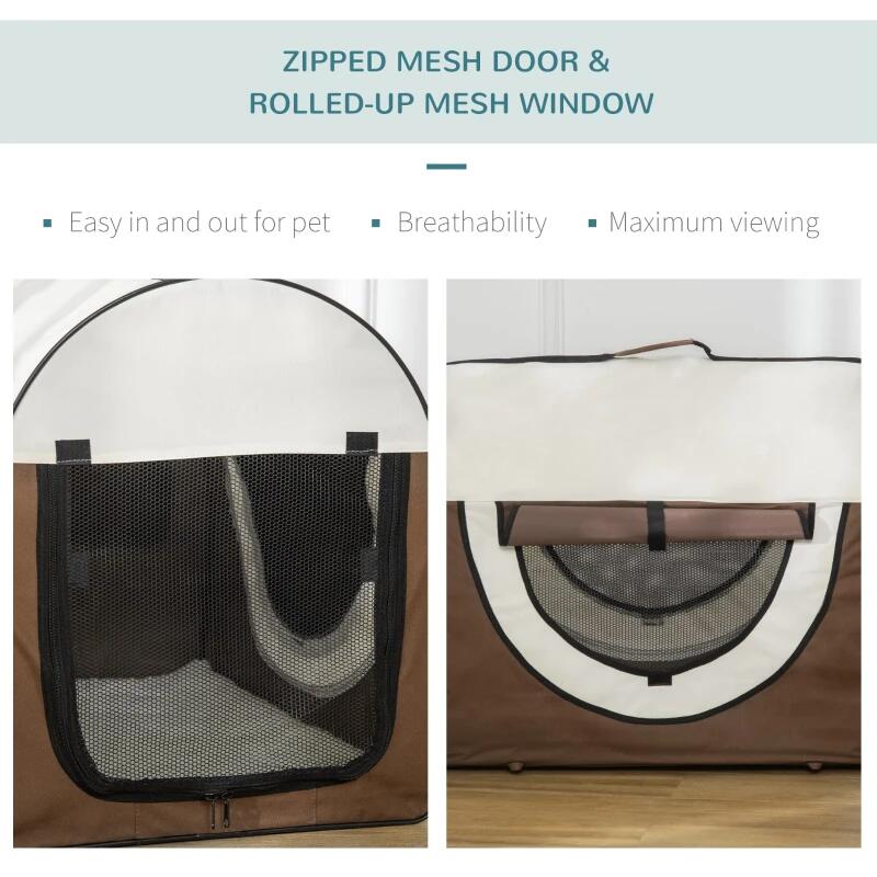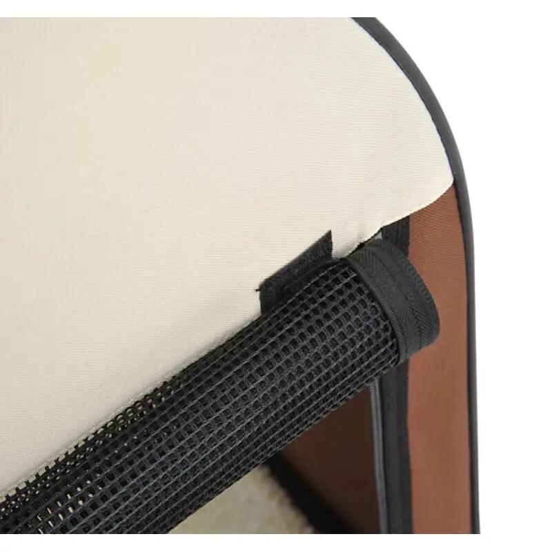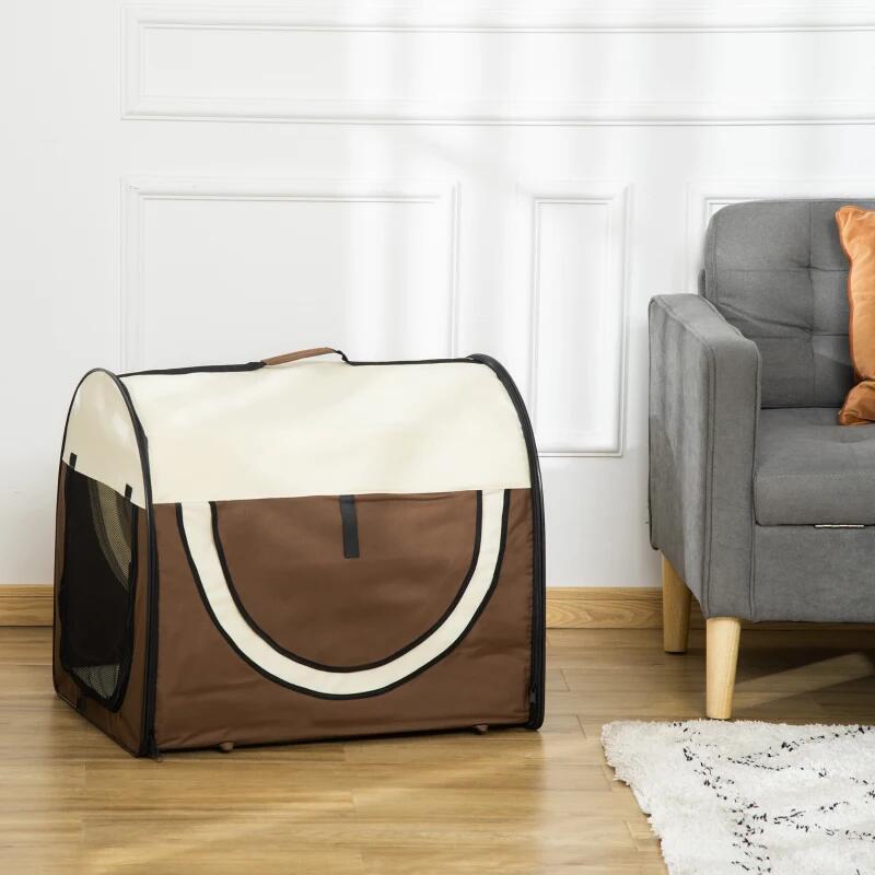Geanta pentru transport caine/pisica, maro si bej, material Oxford, PVC, impermeabila, pliabila, marimea S-M, 70x51x59 cm