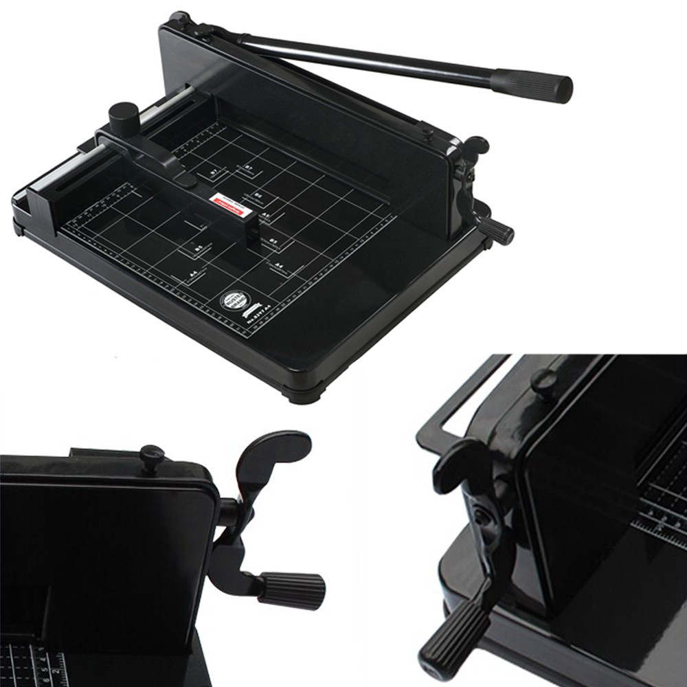 Cum se folosește: Așază teancul pe platformă, aliniază folosind ghidajul și marcajele (cm/mm/inch), fixează poziția, apoi realizează tăierea prin presare cu ajutorul mânerului lung.