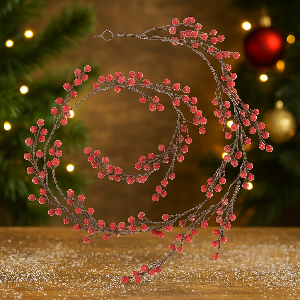 Adaugă un plus de farmec sărbătorilor cu această ghirlandă decorativă cu fructe roșii, potrivită pentru amenajări festive elegante și primitoare. Cu un aspect inspirat din natură, această ghirlandă de Crăciun este ușor de modelat și poate fi așezată pe masă, pe pervaz, în brad sau pe mobilier, pentru un decor cald și armonios.