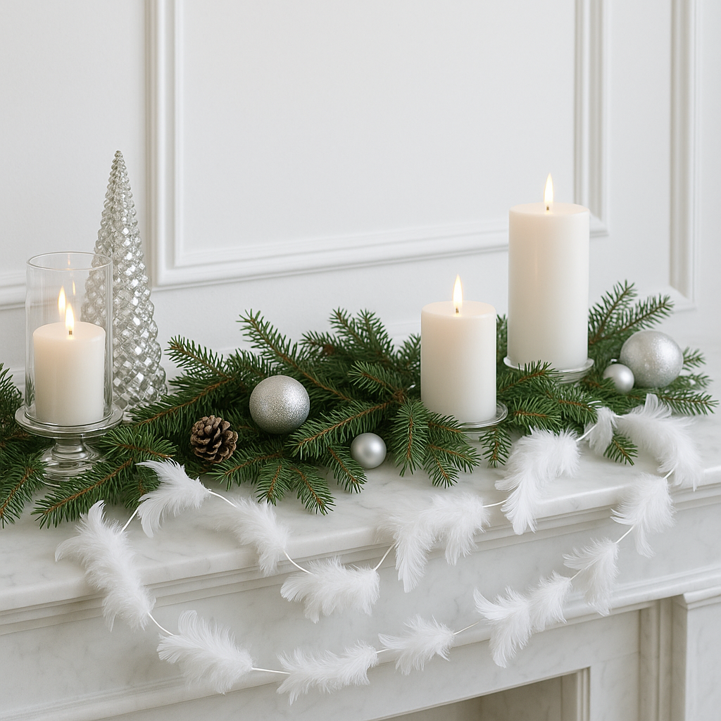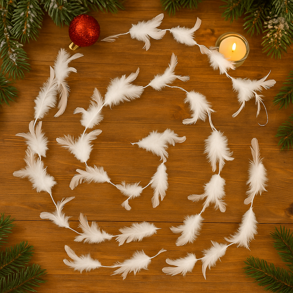 Adauga un aer rafinat sarbatorilor cu aceasta ghirlanda decorativa cu pene albe, perfecta pentru bradul de Craciun, mese festive, vitrine sau aranjamente de sezon. Cu un aspect delicat si elegant, aceasta decoratiune de Craciun alba ofera un plus de stil oricarui spatiu, fiind usor de asezat si de integrat in decoruri moderne, clasice sau glamour.