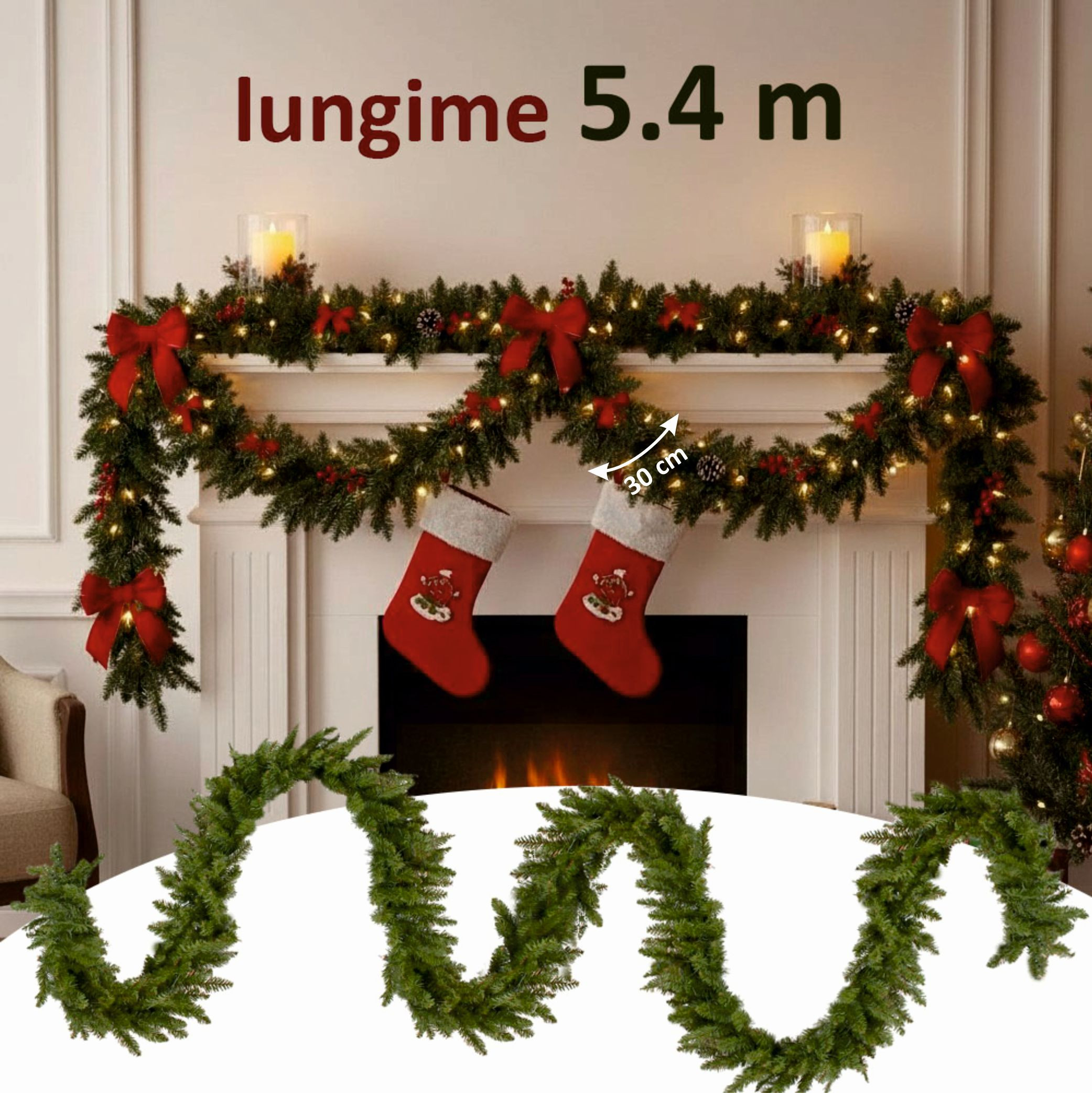 Utilizare: Poți monta ghirlanda pe ușă, la șemineu, pe scări, pe balustrade sau în jurul ferestrelor. Se poate accesoriza cu globuri, funde, flori de bumbac sau instalații luminoase de Crăciun pentru un efect spectaculos.