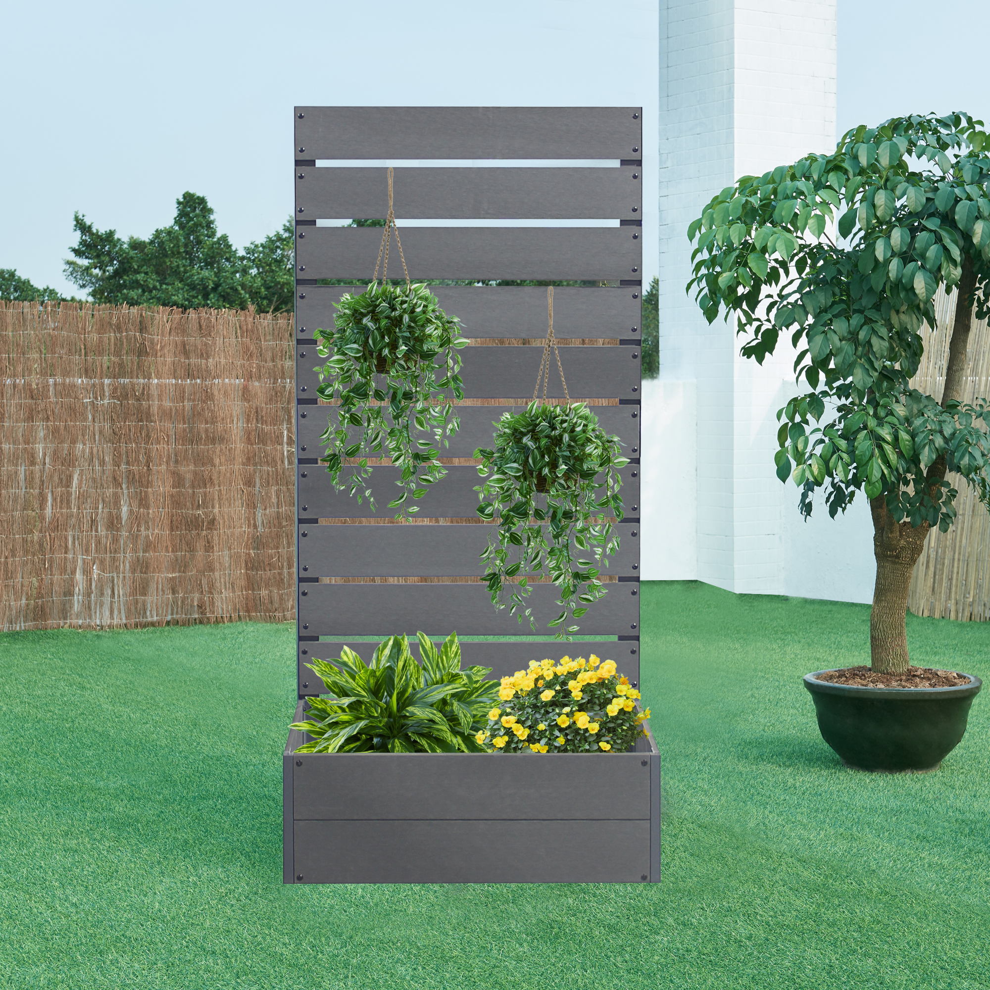 Jardiniera integrată oferă spațiu suficient pentru flori, plante decorative sau ierburi aromatice, iar panoul cu lamele funcționează atât ca paravan de intimitate, cât și ca suport pentru plante cățărătoare. În plus, contribuie la protecția împotriva vântului și a razelor solare, pentru mai mult confort în aer liber.
