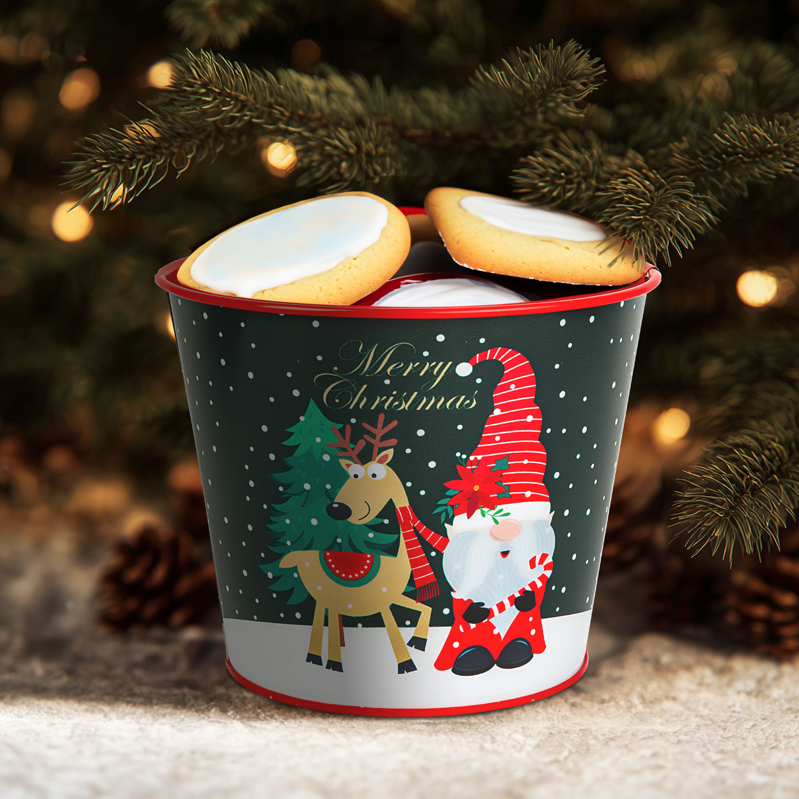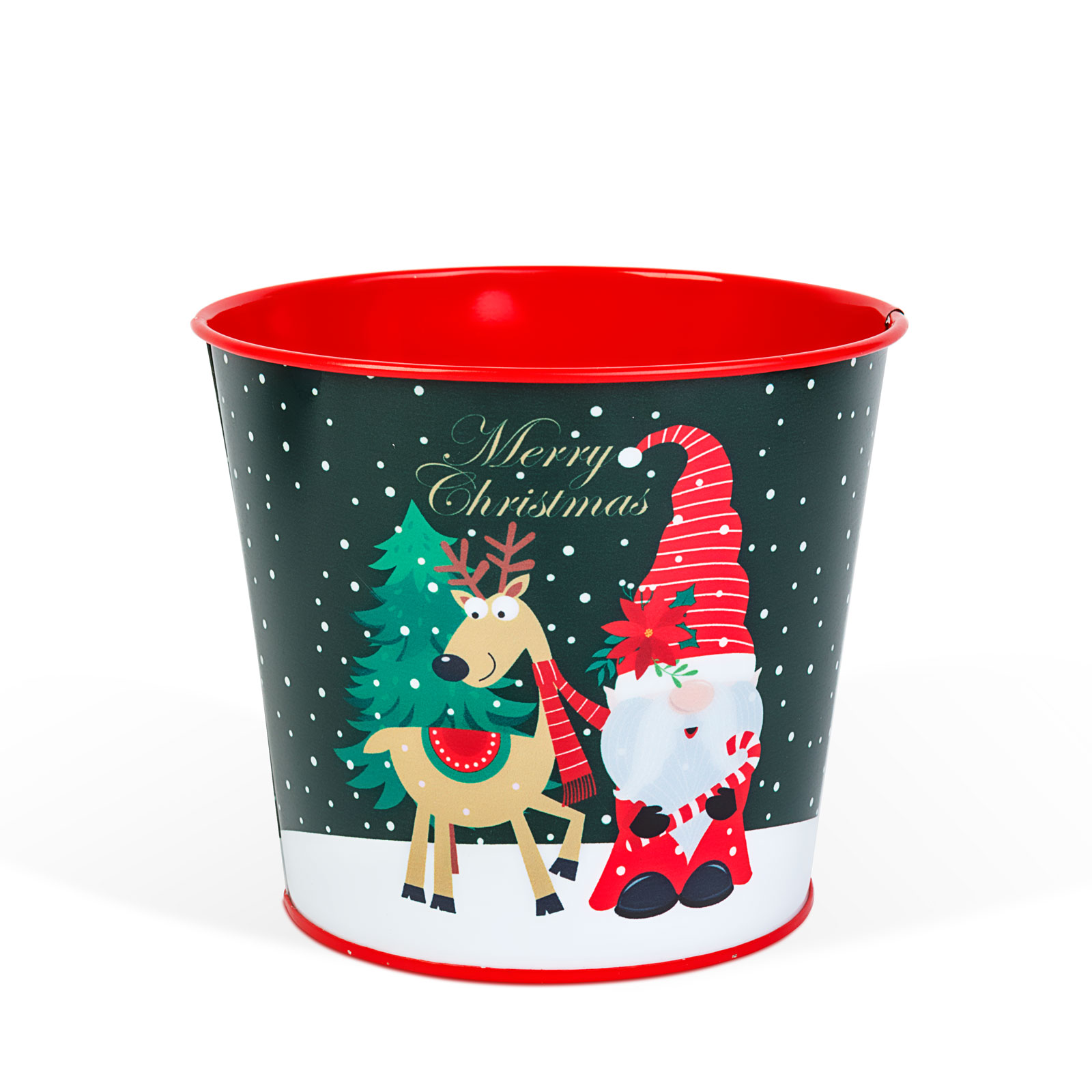 Adaugă o notă veselă și colorată decorului tău festiv cu acest ghiveci metalic decorativ, cu model de spiriduș! Culoarea roșie intensă, detaliile verzi și fundalul cu fulgi de zăpadă creează o atmosferă caldă și plină de bucurie în orice încăpere.
