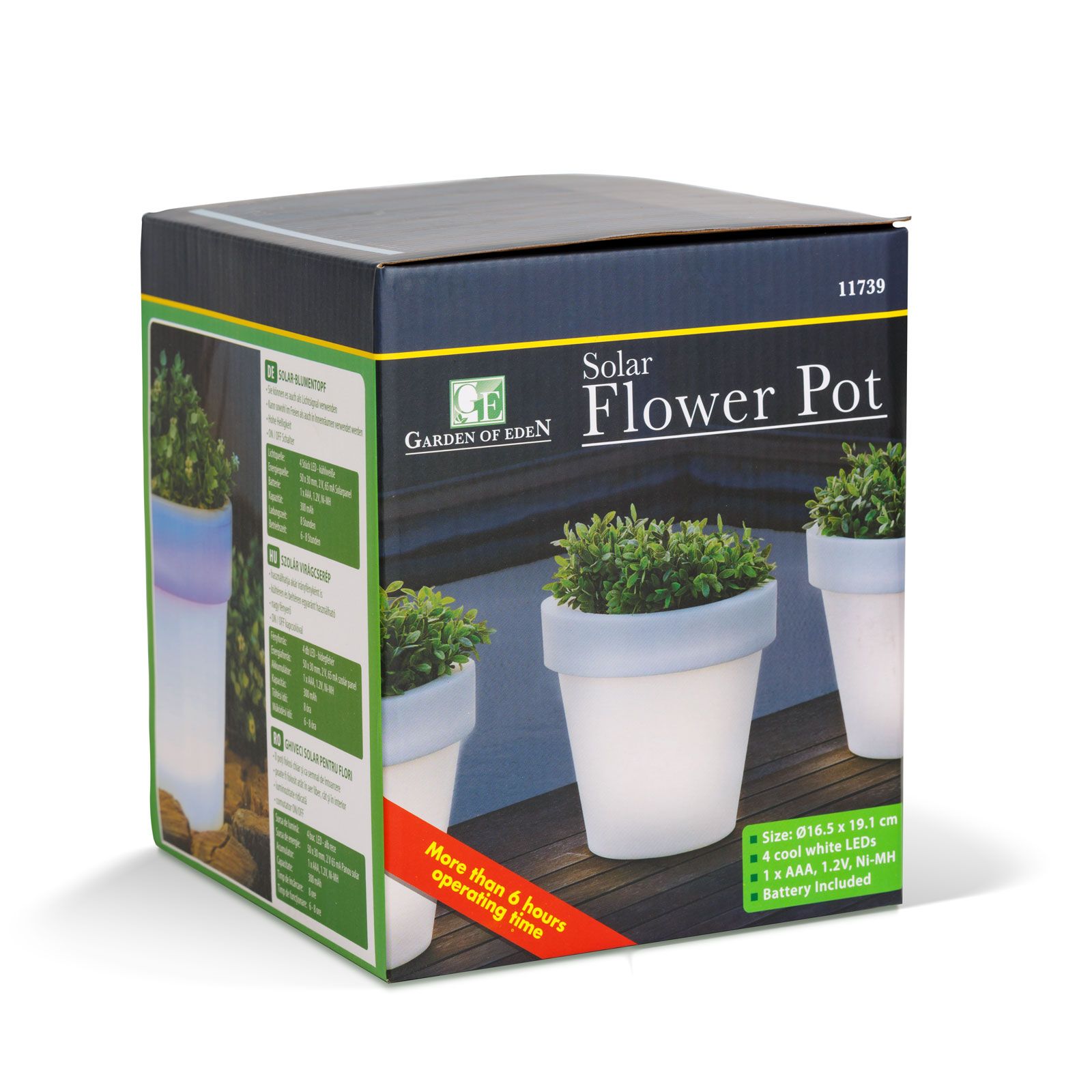 Du-ți plantele la următorul nivel cu acest ghiveci solar elegant! Cu 4 LED-uri alb rece încorporate, va oferi, de asemenea, un afișaj atrăgător pe timp de noapte, luminând plantele tale preferate. Panoul solar reîncarcă bateria în timpul zilei, permițându-vă să iluminați noaptea. De îndată ce se întunecă, lumina se va aprinde și se va stinge automat la răsăritul soarelui. În timpul zilei, celulele solare transformă energia solară în electricitate și o stochează în baterie. Perfect pentru terase, balcoane, grădini sau chiar ca element decorativ pe pervazuri. Bucurați-vă de atmosfera specială pe care ți-o oferă acest ghiveci solar modern!