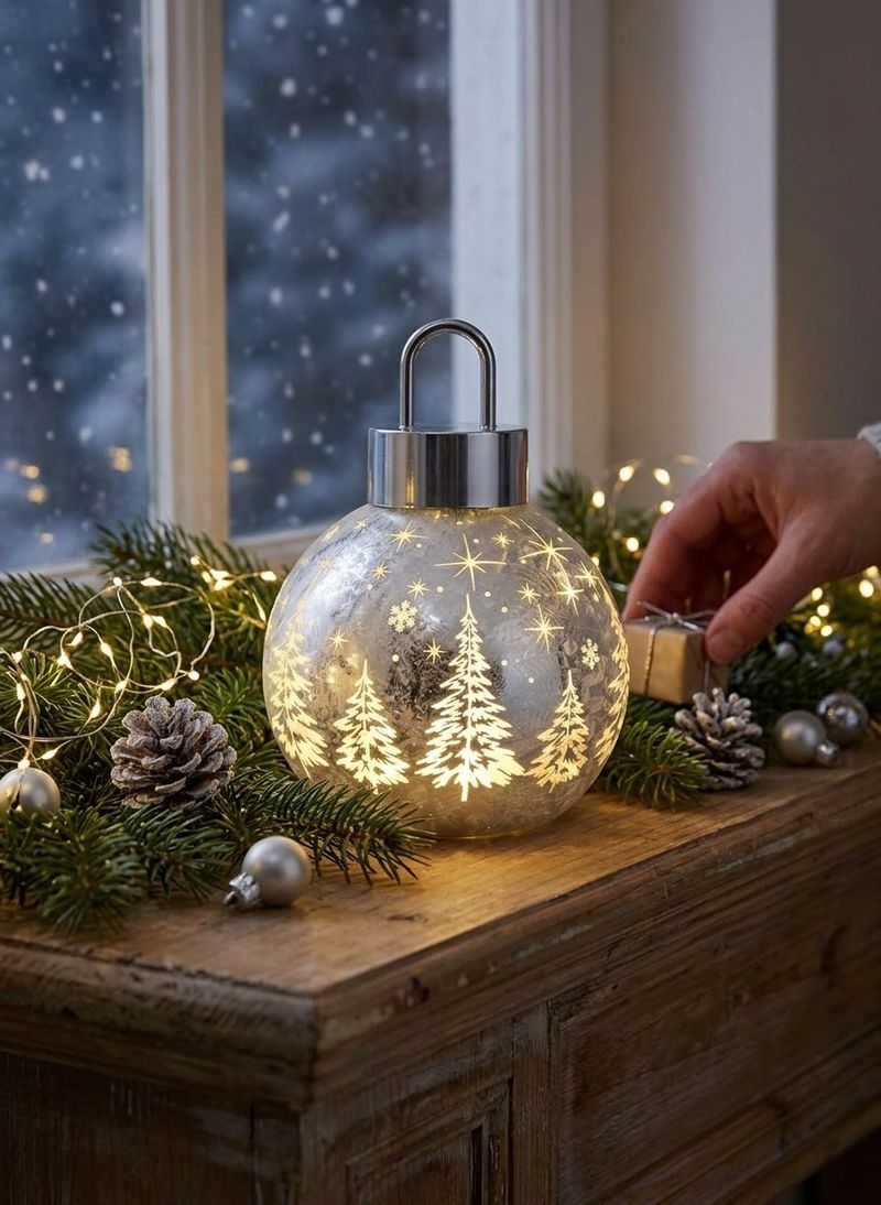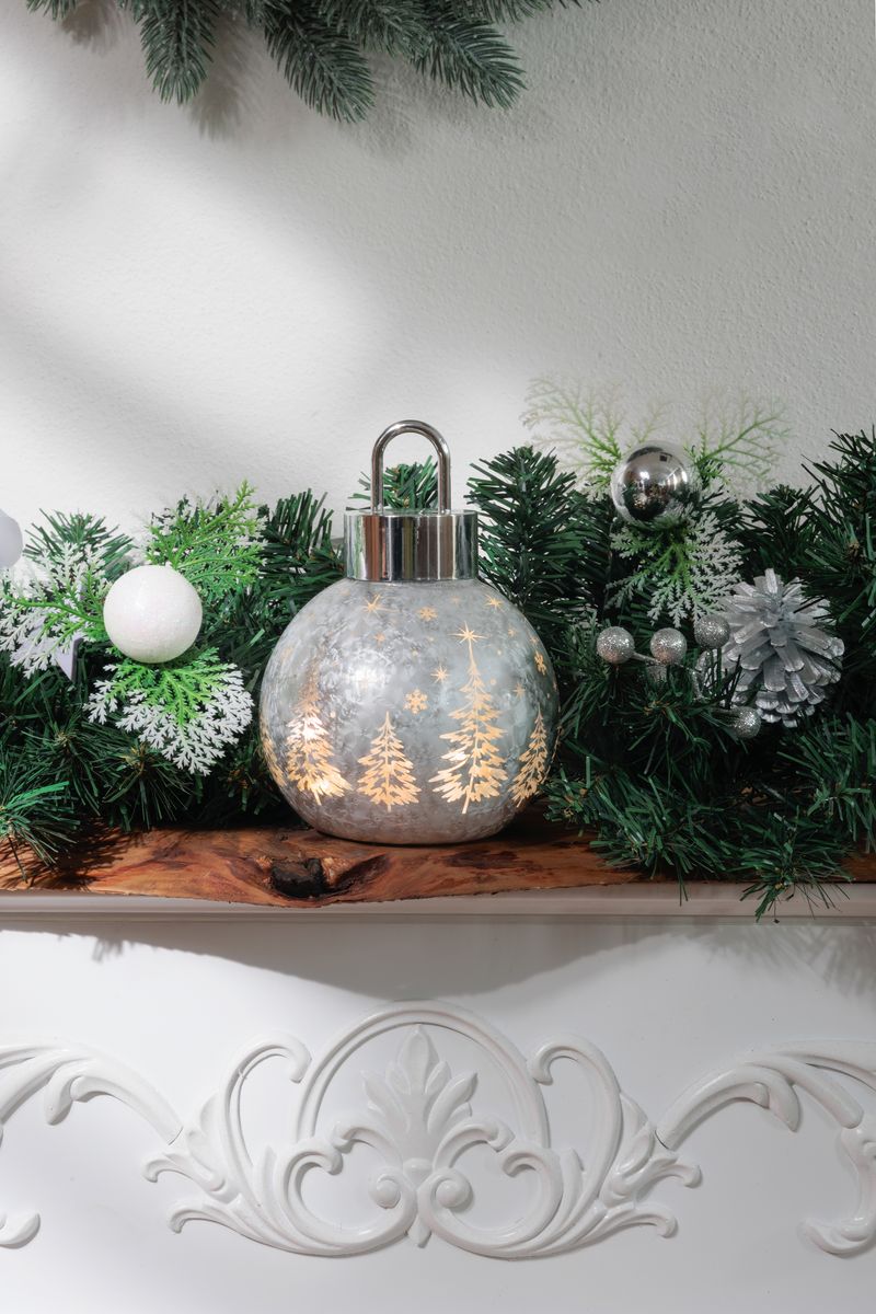 Globul decorativ de Craciun MagicHome aduce un plus de farmec si eleganta in orice incapere, datorita designului din sticla argintie si iluminarii placute cu 10 LED-uri alb cald. Decorat cu motive de brazi si stelute, acest accesoriu creeaza o atmosfera festiva, calda si primitoare, fiind ideal pentru decorul de sarbatoare din living, dormitor sau hol.