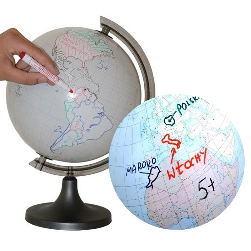 Acest glob pamantesc interactiv este accesoriul potrivit pentru a-i invata pe cei mici geografia intr-un mod distractiv si captivant. Globul reprezinta harta politica a lumii conturata iar cei mici vor trebuii sa coloreze fiecare tara si sa scrie denumirea acesteia cu ajutorul markerelor incluse in pachet. Globul poate fi un cadou potrivit si pentru adultii iubitori de calatorii care isi pot testa si consolida cunostiintele.
