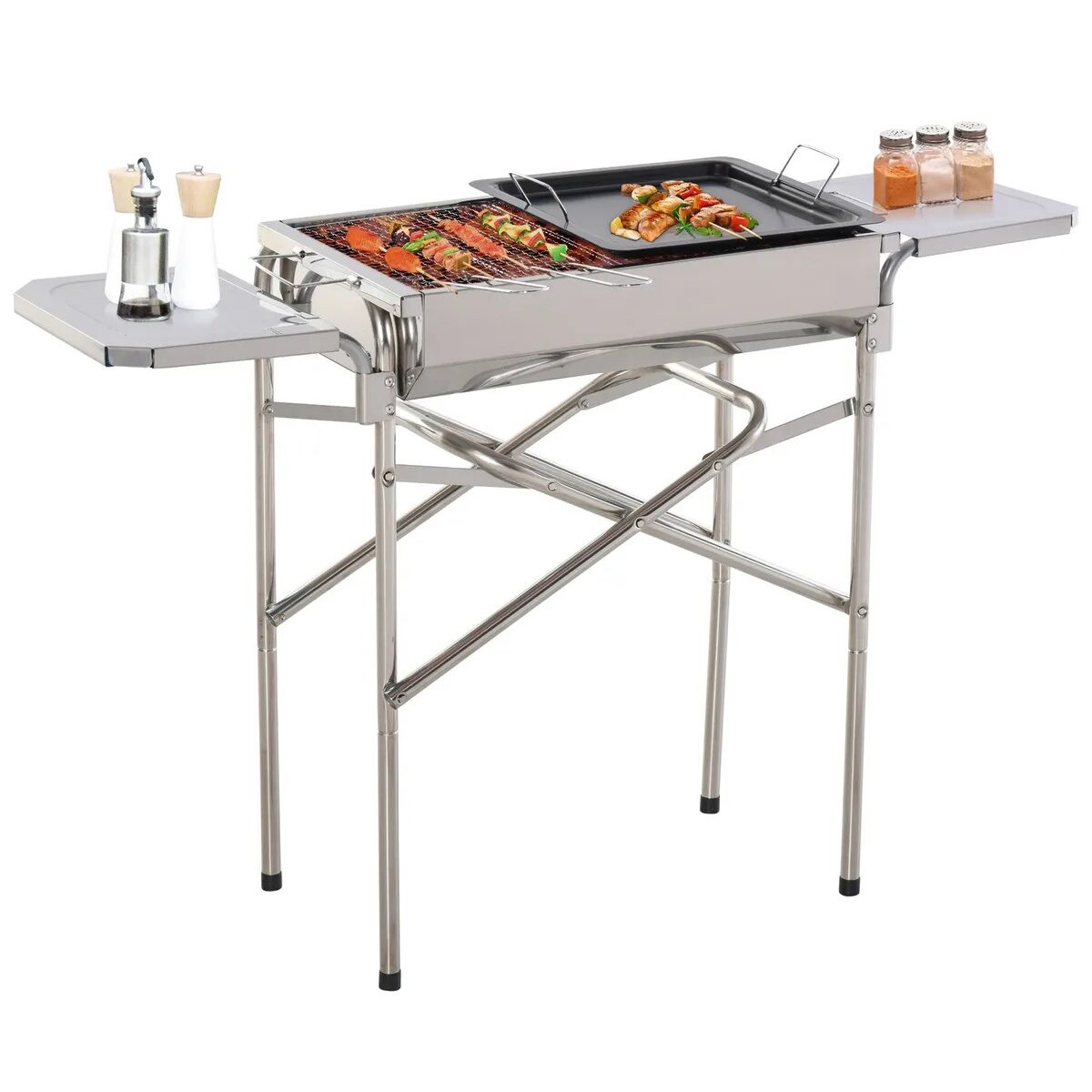 Gratar gradina/camping cu carbuni, portabil, grill dreptunghiular, cu suport condimente, structura inox, 104x30x68 cm