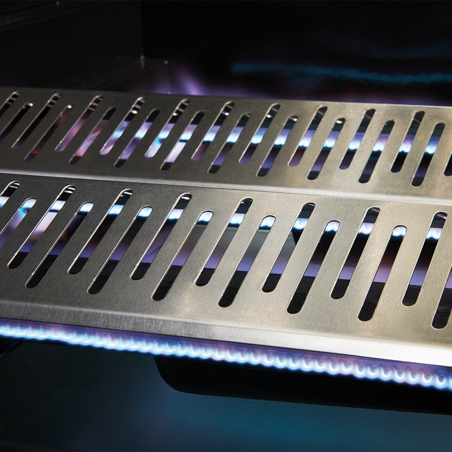 Suprafața de gătit este realizată din două grile de gătit din fontă și o placă acoperite cu smalț porțelanat durabil. Acestea asigură o conductivitate termică excelentă și rețin căldura pentru a asigura gătirea uniformă a alimentelor. Pentru o vizibilitate optimă în timpul gătitului în condiții de lumină scăzută, grătarul este echipat cu lumini cu halogen amplasate în spate. De asemenea, lumini LED sunt integrate în cadranele de control, facilitând citirea și ajustarea setărilor chiar și în întuneric.Siguranță: