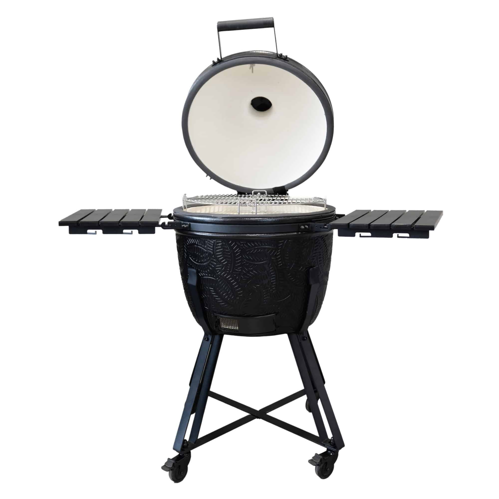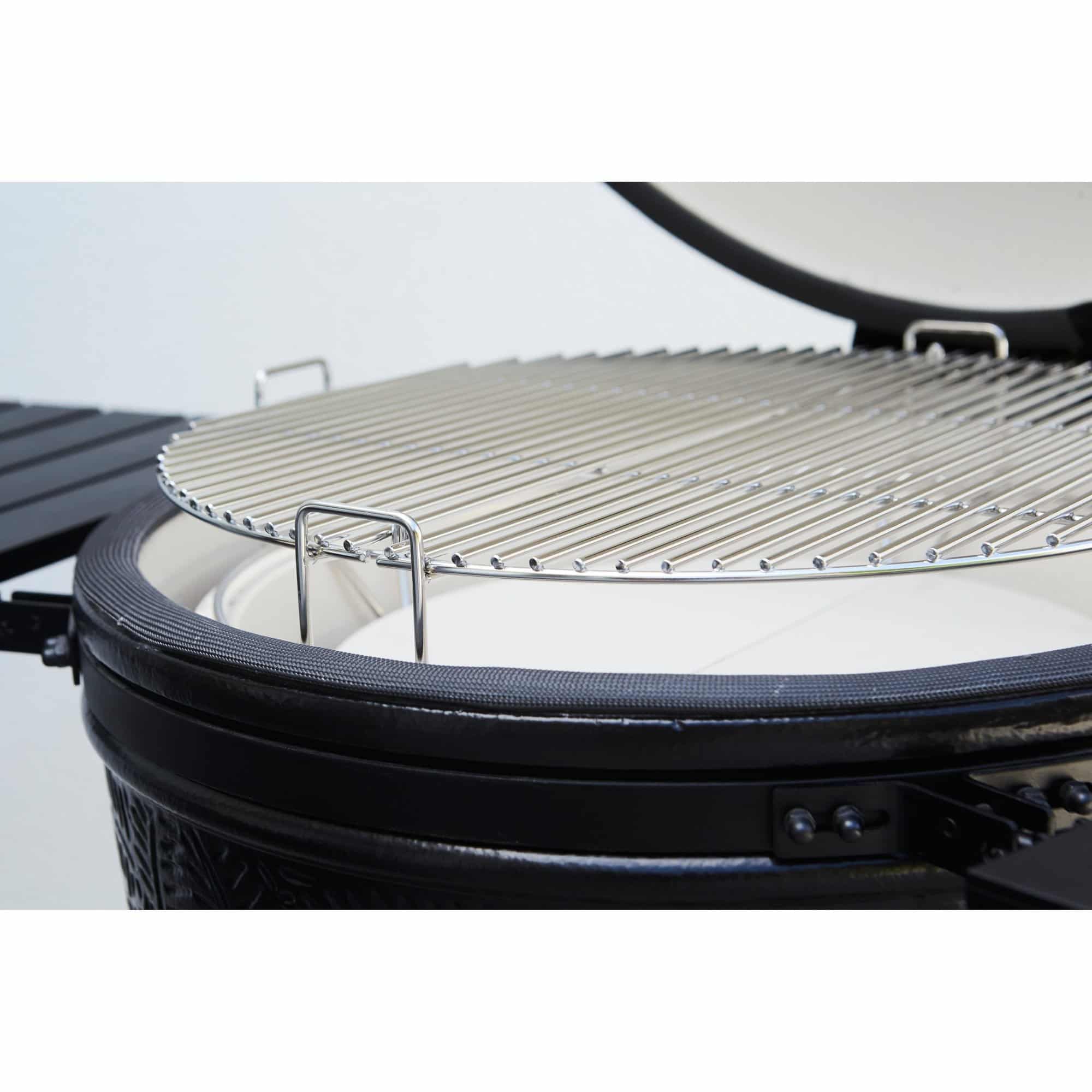 În plus, acest model oferă avantajul de a include un sistem flexibil de gătit cu un grătar reglabil pe două niveluri: acesta poate fi astfel separat și reglat în funcție de nevoile dumneavoastră. Prin urmare, puteți găti mâncarea la două înălțimi diferite sau chiar puteți găti direct în același timp cu gătitul indirect. Pentru a ieși în evidență față de mărcile existente pe piață, Barbecook a acordat o atenție deosebită designului kamadoului său adoptând un design și o textura unică pe rezervor și capac.